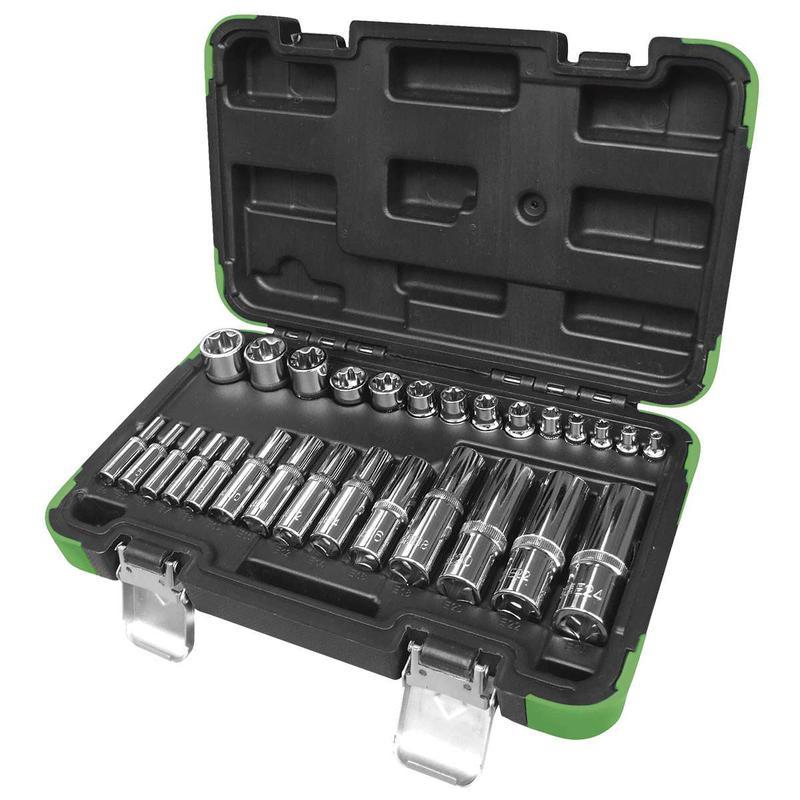 Виробник: JBM Тип інструмента: Торцеві головки Кілька примірників у наявності 28 PCS TORX ¼ "– 50mm: E4, E5, E6, E7, E8 3/8" – 63mm: E10, E11, E12, E14, E16 ½ "– 76mm: E18, E20, E22, E24 ¼ "– 25mm: E4, E5, E6, E7, E8 3/8" – 28mm: E10, E11, E12, E14, E16 ½ " – 38mm: E18, E20, E22, E24