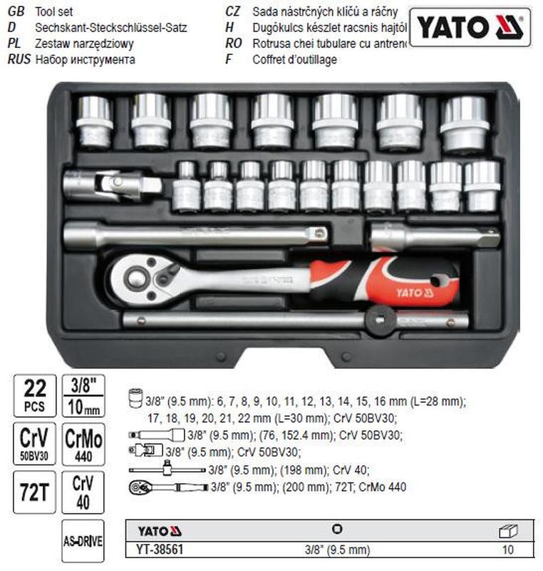 Набор головок торцевих yato 3/8'' м6-22 22 штуки yt-38561