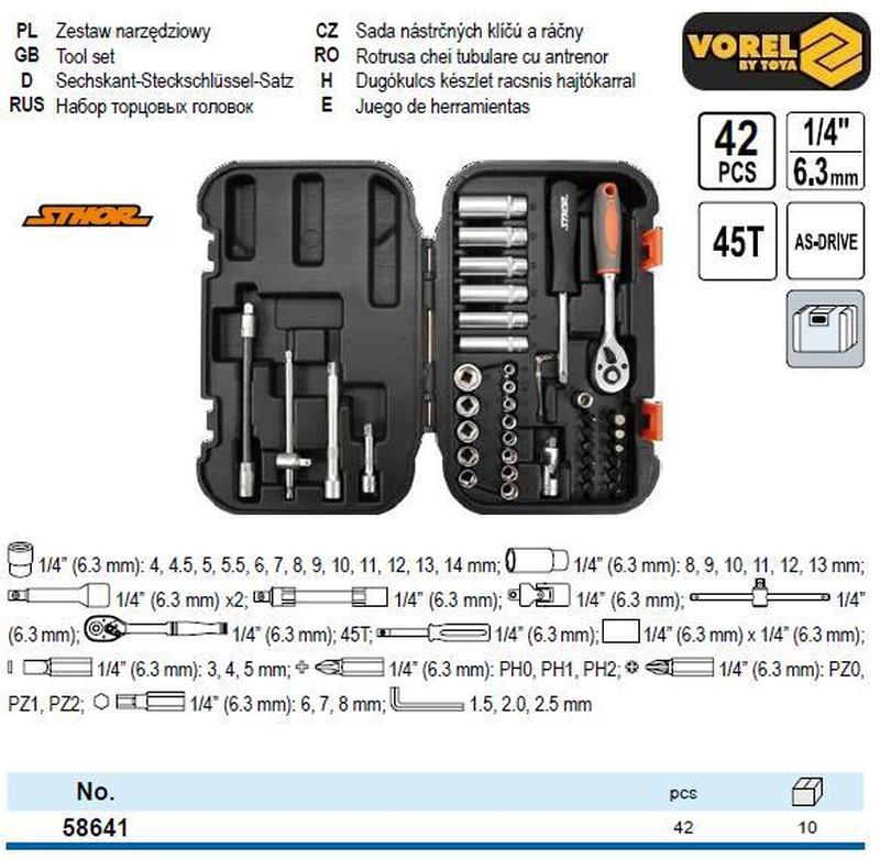 Набор головок торцевых 1/4 42 штуки vorel-58641