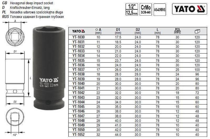 Головка торцевая ударная длинная yato польша 1/2" м=10 l=78 мм yt-1030