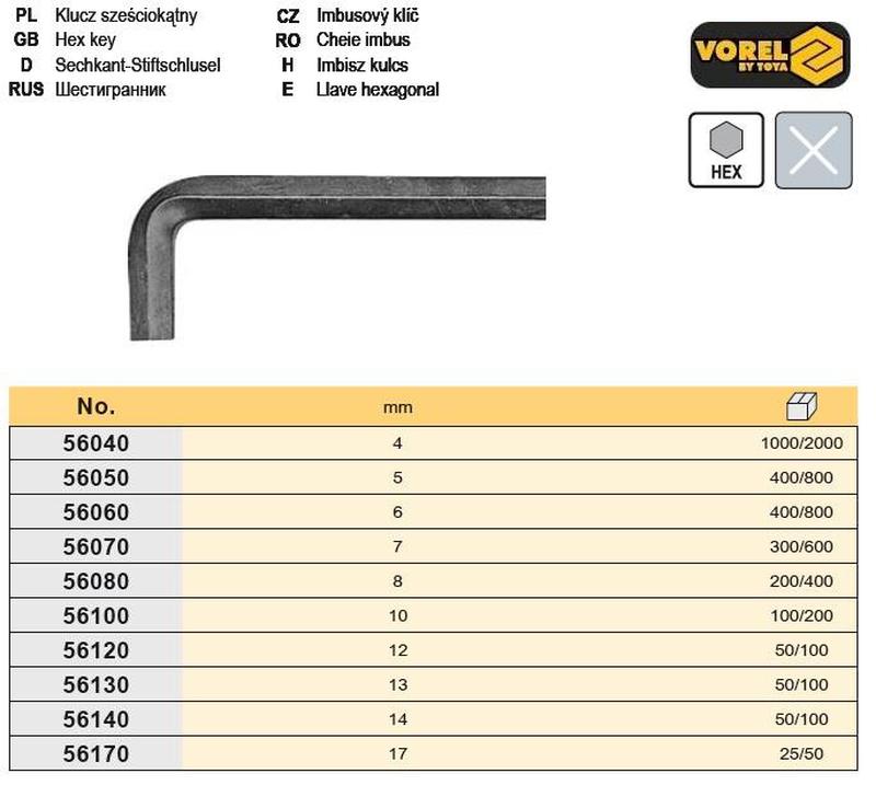 Ключ шестигранный польша тип l hex м10 vorel-560100