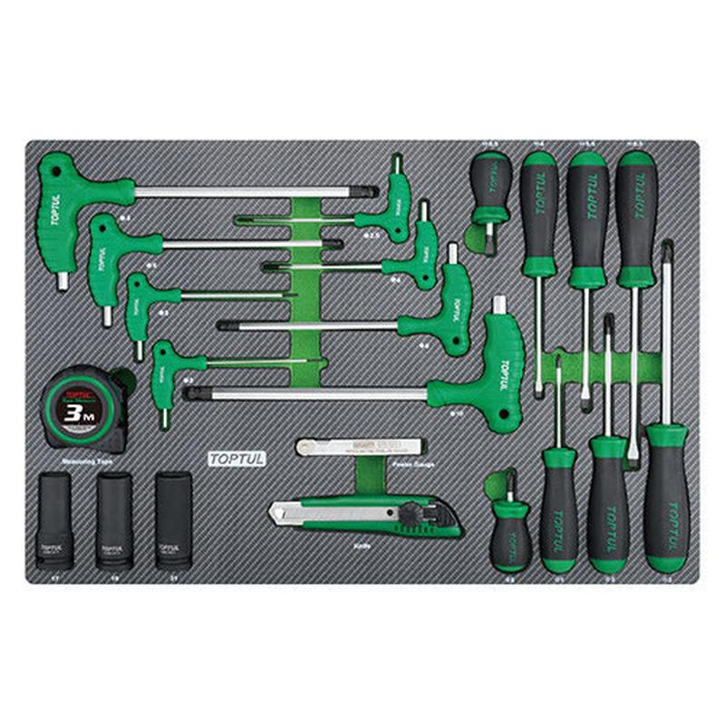 Набір інструменту комбінований 22ед. (в ложементі) TOPTUL GED2224. Всі набори інструментів TOPTUL високої якості в даний час розроблені з 2 взаємозамінними розмірами вкладишів (A і B), що дозволяє користувачам легко комбінувати і поєднувати найбільш підходящий і необхідний інструмент у кожному ящику.
