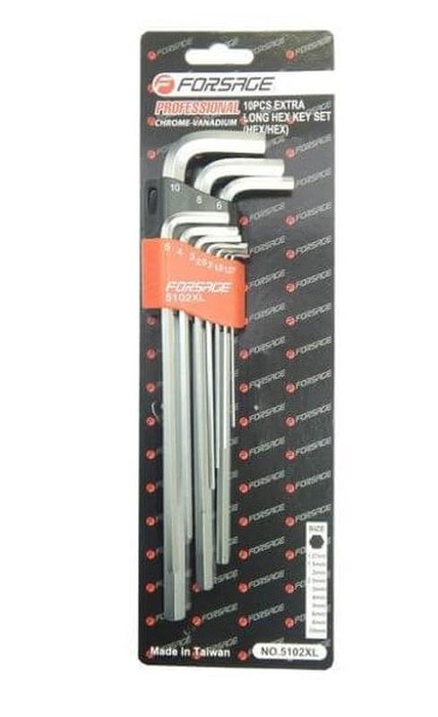 Набор шестигранных ключей Forsage F-5102XL представляет собой комплект инструмента высокой прочности. Комплект имеет широкую сферу применения за счет использования различных размеров и наличия защитного покрытия.Набор- Ключи: 1.27, 1.5, 2, 2.5, 3-6, 8, 10 мм- Пластиковый держательОсобенности - Тип: HEX, 6-гранный- Покрытие: хромированное- Материал: CR-V- Форма: Г-образная, экстра длинная
