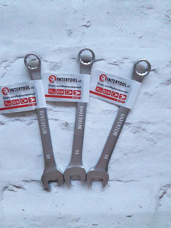 Ключ комбинированный Cr-V INTERTOOL HT-1211 станет отличным помощником в работе любого мастера. Это качественное сочетание двух наиболее распространенных видов ключей -- накидного и рожкового. Обе головки имеют одинаковый размер -- 11мм. Ключ изготавливается из легированного хромванадиевого сплава, что обеспечивает высокие эксплуатационные характеристики. Сатин-хромовое покрытие надежно защищает инструмент от коррозии. Особенности Комбинированный -- накидной и рожковый ключ, Защищен от коррозии, Удобная форма, хорошо лежит в руке. Назначение Комбинированный рожково-накидной ключ, размером 10 мм - это неотъемлемый инструмент для выполнения различных задач на откручивание, закручивание крепежей. Широко используется во всех сферах от бытового применения до профессионального, благодаря высоким эксплуатационным характеристикам. Максимальная производительность Рожковая часть ключа позволяет получить удобный доступ к креплению в труднодоступных местах. Накидная часть с двенадцатью гранями увеличивает площадь прилегания поверхностей и снижает риск срыва граней гаек и болтов. Удобная форма и изгиб рукоятки ключа обеспечивают оптимальные условия для приложения усилия, благодаря чему вы с легкостью закрутите, открутите крепежный элемент. Надежная работа Ключ изготовлен из прочной Cr-V стали, что гарантирует исключительную износостойкость и долговечность. Он выдерживает нагрузки, не деформируется и обладает антикоррозийной стойкостью. Поверхность ключа матирована сатин-хромом для надежного захвата в работу даже испачканными в масле руками.