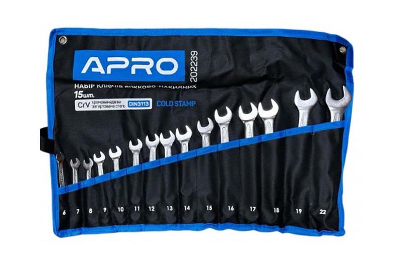 Набор рожково-накидных ключей Apro – отличный набор из 15 комбинированных ключей, каждый из которых представляет собой сочетание рожкового и накидного. Комбинированные ключи используются для монтажных, слесарных работ. Особенно широко они используются автослесарями. Ключи универсальны и практичны, позволяют работать с разными крепежными элементами – болтами, гайками и т.д. Количество ключей в наборе: 15 ед.; Размеры: 6-22 мм