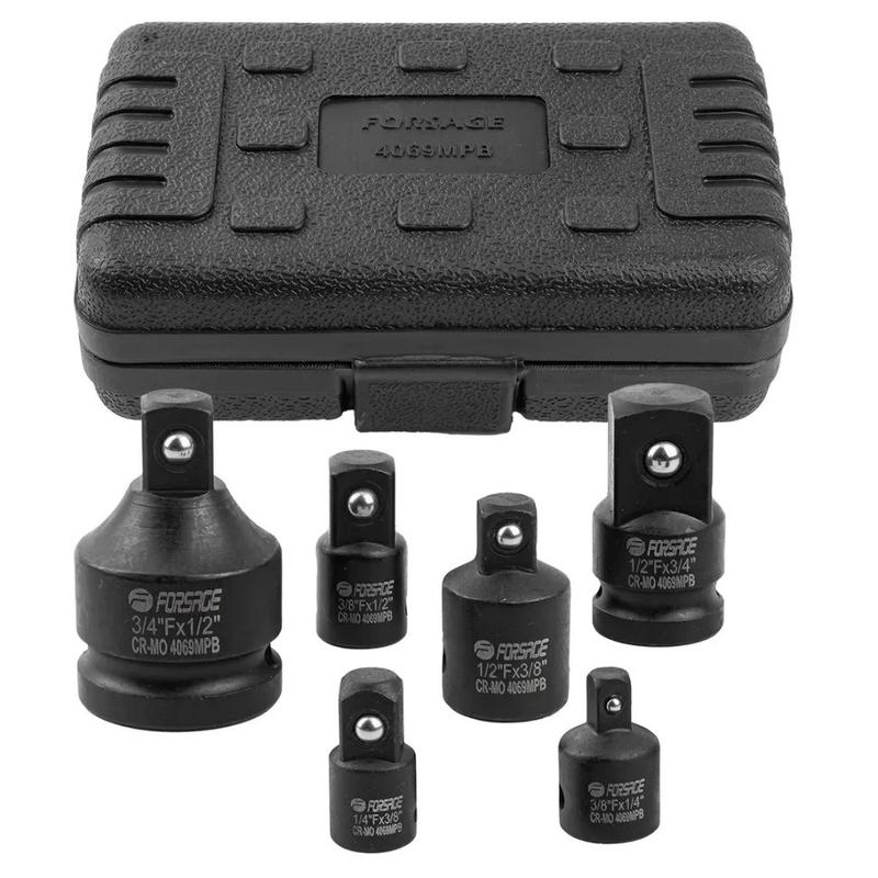 Набор ударных переходных адаптеров FORSAGE F-4069MPB — это универсальное решение для работы с торцевыми головками при отсутствии подходящего трещоточного ключа, воротка или ударного гайковерта. Подходит как для профессионального, так и для бытового использования. Преимущества набора: Прочность и надежность: адаптеры изготовлены из высококачественного хром- молибденового сплава (Cr-Mo), обеспечивая высокую устойчивость к износу и нагрузкам. Разнообразие размеров: в комплект входят адаптеры: 1/4"(F) x 3/8"(M) 3/8"(F) x 1/4"(M) 3/8"(F) x 1/2"(M) 1/2"(F) x 3/8"(M) 1/2"(F) x 3/4"(M) 3/4"(F) x 1/2"(M) Универсальность: позволяет быстро переключаться между инструментами с разными приводами, не теряя времени на подбор подходящего оснащения. Удобство хранения: все элементы набора размещены в прочном пластиковом кейсе, что облегчает транспортировку и организацию рабочего места. Идеален для автосервисов, строительных и промышленных задач, где важны надежность, скорость и удобство в работе.