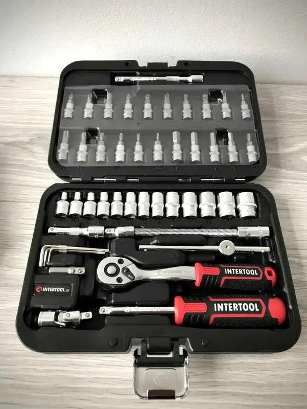 Недорогой набор инструментов для автомобиля, Набор профессиональных инструментов для автомобиля 46ед, NST Наборы инструментов INTERTOOL STORM - это новое слово в поддержку качества и многофункциональности! Благодаря своей практичности идеально подходят для автолюбителей и домашних мастеров. Широкий выбор инструментов позволяет справиться почти с любым видом крепежа, что очень выручает при внезапных поломках в дороге и во время ремонтных работ в гараже. Функционал Комплектация набора с приводом 1/4" понадобится для выполнения подавляющего большинства работ, связанных с ремонтом оборудования, авто-, мото-, велотехники, а также прочих работ в быту и в гараже каждого домашнего мастера. В комплекте самые популярные размеры торцевых головок, а также кардан, вороток и гибкий удлинитель для откручивания и закручивания крепежей в труднодоступных местах. Различные типы головок с насадками пригодятся для работы со шлицами, которые часто используют в мебельной промышленности, в приборостроении и пр. Удобная и надежная трещотка Механизм трещотки на 72 зуба изготовлен в Тайване. Отличается плавным ходом храпового механизма, а также прочностью и износостойкостью. Быстрый сброс головок и наличие реверса упростят и во множество раз ускорят работу мастера. Трещотка имеет изогнутую рукоятку для работы в труднодоступных местах. Ручка с трехкомпонентным покрытием из TPR резины для максимального хвата, не скользит и не выпадает из рук. Головки туго сидят на посадочном квадрате трещотки 1/4", не спадают и плотно прилегают к поверхности крепежа. На каждой головке нанесены насечки для предотвращения скольжения в руках. Долговечность и износостойкость Все инструменты изготовлены из прочной и выносливой Cr-V стали. Головки и трещотка из Cr-V 50BV30, отличаются длительным сроком службы, имеют запас прочности и устойчивы к нагрузкам. Двухслойное никелевое покрытие обеспечивает антикоррозионные свойства инструментов. Каждая бита выполнена из стали Cr-V 6150 с отличными показателями твердости и упругости в своем сегменте. Противоударный кейс Все инструменты упакованы в компактный кейс с надежным металлическим замком. Комплектующие прочно зафиксированы на своих посадочных местах и не выпадают при транспортировке. Благодаря небольшим габаритам кейса (220*160*60 мм) набор поместится в любой кладовке, бардачке или на полке в гараже. Современный яркий дизайн точно не оставит никого равнодушным! Комплектация * * * Трещоточная рукоятка 1/4", 72 зуба, реверсионная; Головка шестигранная торцевая 1/4", 13 шт.: 4, 4.5, 5, 5.5, 6, 7, 8, 9, 10, 11, 12, 13, 14 мм; Удлинитель 1/4" 50, 100 мм; Гибкий удлинитель 150 мм; Вороток 115 мм; Кардан 1/4"; Адаптер для шуруповерта 1/4"; Держатель 1/4" для головок и бит 150 мм. Головки-биты: TORX 6 шт.: T10, T15, T20, T25, T30, Т40; HEX 6 шт.: 3, 4, 5, 6, 7, 8 мм; PH 3 шт.: PH1, PH2, PH3; PZ 3 шт.: PZ1, PZ2, PZ3; SL 3 шт.: SL4, SL5.5, SL7. Набор Г-образных шестигранных ключей 4 шт.: 1.27, 1.5, 2, 2.5 мм.