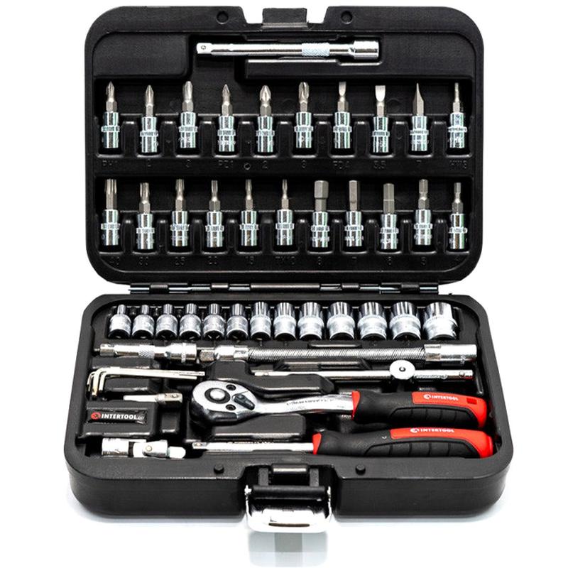 Универсальный многофункциональный набор инструментов, Профессиональный набор инструмента 1/2 46ед, NST Наборы инструментов INTERTOOL STORM - это новое слово в поддержку качества и многофункциональности! Благодаря своей практичности идеально подходят для автолюбителей и домашних мастеров. Широкий выбор инструментов позволяет справиться почти с любым видом крепежа, что очень выручает при внезапных поломках в дороге и во время ремонтных работ в гараже. Функционал Комплектация набора с приводом 1/4" понадобится для выполнения подавляющего большинства работ, связанных с ремонтом оборудования, авто-, мото-, велотехники, а также прочих работ в быту и в гараже каждого домашнего мастера. В комплекте самые популярные размеры торцевых головок, а также кардан, вороток и гибкий удлинитель для откручивания и закручивания крепежей в труднодоступных местах. Различные типы головок с насадками пригодятся для работы со шлицами, которые часто используют в мебельной промышленности, в приборостроении и пр. Удобная и надежная трещотка Механизм трещотки на 72 зуба изготовлен в Тайване. Отличается плавным ходом храпового механизма, а также прочностью и износостойкостью. Быстрый сброс головок и наличие реверса упростят и во множество раз ускорят работу мастера. Трещотка имеет изогнутую рукоятку для работы в труднодоступных местах. Ручка с трехкомпонентным покрытием из TPR резины для максимального хвата, не скользит и не выпадает из рук. Головки туго сидят на посадочном квадрате трещотки 1/4", не спадают и плотно прилегают к поверхности крепежа. На каждой головке нанесены насечки для предотвращения скольжения в руках. Долговечность и износостойкость Все инструменты изготовлены из прочной и выносливой Cr-V стали. Головки и трещотка из Cr-V 50BV30, отличаются длительным сроком службы, имеют запас прочности и устойчивы к нагрузкам. Двухслойное никелевое покрытие обеспечивает антикоррозионные свойства инструментов. Каждая бита выполнена из стали Cr-V 6150 с отличными показателями твердости и упругости в своем сегменте. Противоударный кейс Все инструменты упакованы в компактный кейс с надежным металлическим замком. Комплектующие прочно зафиксированы на своих посадочных местах и не выпадают при транспортировке. Благодаря небольшим габаритам кейса (220*160*60 мм) набор поместится в любой кладовке, бардачке или на полке в гараже. Современный яркий дизайн точно не оставит никого равнодушным! Комплектация * * * Трещоточная рукоятка 1/4", 72 зуба, реверсионная; Головка шестигранная торцевая 1/4", 13 шт.: 4, 4.5, 5, 5.5, 6, 7, 8, 9, 10, 11, 12, 13, 14 мм; Удлинитель 1/4" 50, 100 мм; Гибкий удлинитель 150 мм; Вороток 115 мм; Кардан 1/4"; Адаптер для шуруповерта 1/4"; Держатель 1/4" для головок и бит 150 мм. Головки-биты: TORX 6 шт.: T10, T15, T20, T25, T30, Т40; HEX 6 шт.: 3, 4, 5, 6, 7, 8 мм; PH 3 шт.: PH1, PH2, PH3; PZ 3 шт.: PZ1, PZ2, PZ3; SL 3 шт.: SL4, SL5.5, SL7. Набор Г-образных шестигранных ключей 4 шт.: 1.27, 1.5, 2, 2.5 мм.
