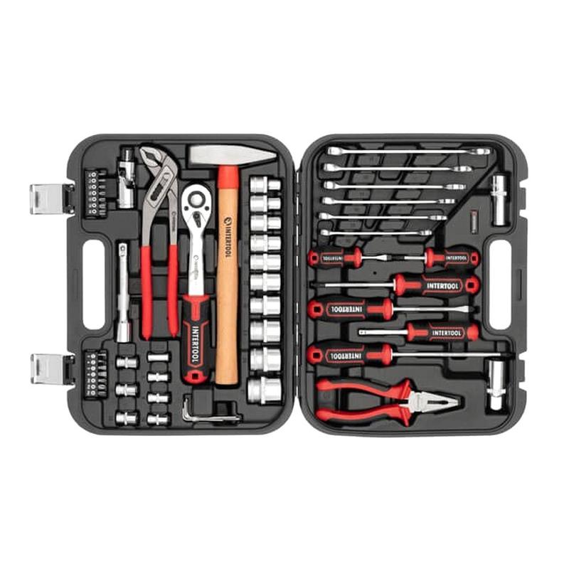 Набір інструментів 216 56ед, Набір торцевих головок інтертул, Набір торцевих гайкових ключів, NST - Набір містить максимум необхідних інструментів як для домашнього використання, так і для автомайстерні - Підходить для роботи з різними вузлами та механізмами автомобіля та техніки - Двошарове покриття нікелем підвищує міцність, витривалість і антикорозійну стійкість інструментів - Високоякісний і довговічний інструмент, виготовлений із Cr-V сталі, кращої у своєму сегменті - Ручки інструментів тришарові прогумовані, для кращої фіксації в руках - Протиударний кейс із металевими замками - Зручні та надійні тріскачки на 72 зубці з тайванським механізмом - Швидкий добір інструмента, комірки з маркуванням розміру і надійною фіксацією Комплектація * * * Тріскачкова ручка 1/2", 72 зуби, реверсійна; Головка шестигранна торцева 1/2", 10 шт.: 10, 11, 12, 13, 15, 17, 19, 22, 24, 27 мм; Головка свічкова 1/2", 2 шт.: 16, 21 мм; Подовжувач 1/2" 125 мм; Кардан 1/2". Головка шестигранна торцева 1/4", 6 шт.: 8, 9, 10, 11, 12, 13 мм; Тримач 1/4" для головок і біт 150 мм; Перехідник для біт 1/4". Біти: TORX 7 шт.: T10, T15, T20, T25, T27, T30, Т40; PH 3 шт.: PH1, PH2, PH3; SL 4 шт.: SL3, SL4, SL5, SL6. Викрутка PH1*38 мм; Викрутка PH2*100 мм; Викрутка PZ2*150 мм; Викрутка SL5*38 мм; Викрутка SL6*100 мм. Набір комбінованих ключів, 6 шт.: 10, 12, 13, 14, 15, 17 мм; Набір Г-подібних шестигранних ключів, 4 шт.: 1,5 мм, 2 мм, 3 мм, 4 мм. Кліщі сантехнічні 250 мм; Плоскогубці 180 мм; Молоток 400 гр.