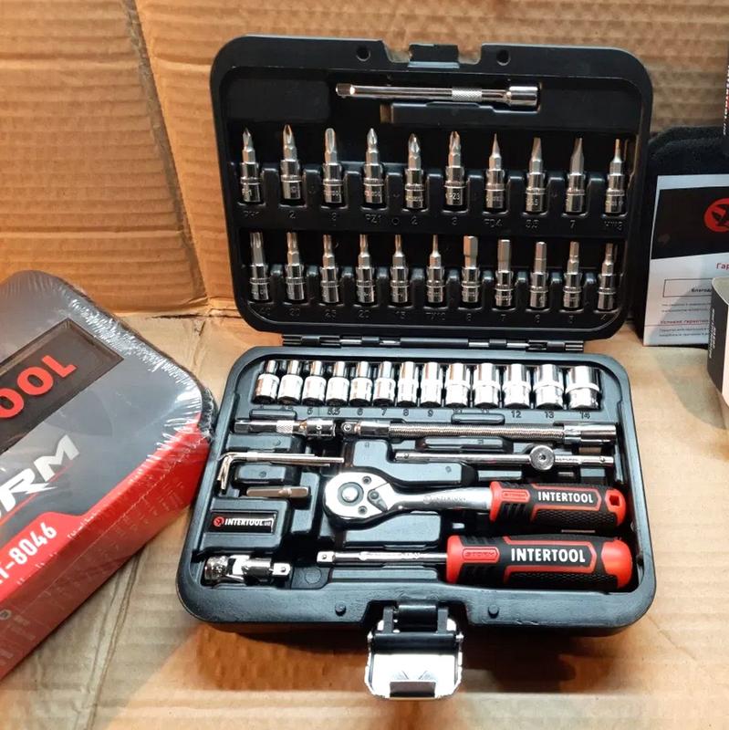 Инструменты набор бит 46ед, Профессиональный набор инструментов 1/4, NST Наборы инструментов INTERTOOL STORM - это новое слово в поддержку качества и многофункциональности! Благодаря своей практичности идеально подходят для автолюбителей и домашних мастеров. Широкий выбор инструментов позволяет справиться почти с любым видом крепежа, что очень выручает при внезапных поломках в дороге и во время ремонтных работ в гараже. Функционал Комплектация набора с приводом 1/4" понадобится для выполнения подавляющего большинства работ, связанных с ремонтом оборудования, авто-, мото-, велотехники, а также прочих работ в быту и в гараже каждого домашнего мастера. В комплекте самые популярные размеры торцевых головок, а также кардан, вороток и гибкий удлинитель для откручивания и закручивания крепежей в труднодоступных местах. Различные типы головок с насадками пригодятся для работы со шлицами, которые часто используют в мебельной промышленности, в приборостроении и пр. Удобная и надежная трещотка Механизм трещотки на 72 зуба изготовлен в Тайване. Отличается плавным ходом храпового механизма, а также прочностью и износостойкостью. Быстрый сброс головок и наличие реверса упростят и во множество раз ускорят работу мастера. Трещотка имеет изогнутую рукоятку для работы в труднодоступных местах. Ручка с трехкомпонентным покрытием из TPR резины для максимального хвата, не скользит и не выпадает из рук. Головки туго сидят на посадочном квадрате трещотки 1/4", не спадают и плотно прилегают к поверхности крепежа. На каждой головке нанесены насечки для предотвращения скольжения в руках. Долговечность и износостойкость Все инструменты изготовлены из прочной и выносливой Cr-V стали. Головки и трещотка из Cr-V 50BV30, отличаются длительным сроком службы, имеют запас прочности и устойчивы к нагрузкам. Двухслойное никелевое покрытие обеспечивает антикоррозионные свойства инструментов. Каждая бита выполнена из стали Cr-V 6150 с отличными показателями твердости и упругости в своем сегменте. Противоударный кейс Все инструменты упакованы в компактный кейс с надежным металлическим замком. Комплектующие прочно зафиксированы на своих посадочных местах и не выпадают при транспортировке. Благодаря небольшим габаритам кейса (220*160*60 мм) набор поместится в любой кладовке, бардачке или на полке в гараже. Современный яркий дизайн точно не оставит никого равнодушным! Комплектация * * * Трещоточная рукоятка 1/4", 72 зуба, реверсионная; Головка шестигранная торцевая 1/4", 13 шт.: 4, 4.5, 5, 5.5, 6, 7, 8, 9, 10, 11, 12, 13, 14 мм; Удлинитель 1/4" 50, 100 мм; Гибкий удлинитель 150 мм; Вороток 115 мм; Кардан 1/4"; Адаптер для шуруповерта 1/4"; Держатель 1/4" для головок и бит 150 мм. Головки-биты: TORX 6 шт.: T10, T15, T20, T25, T30, Т40; HEX 6 шт.: 3, 4, 5, 6, 7, 8 мм; PH 3 шт.: PH1, PH2, PH3; PZ 3 шт.: PZ1, PZ2, PZ3; SL 3 шт.: SL4, SL5.5, SL7. Набор Г-образных шестигранных ключей 4 шт.: 1.27, 1.5, 2, 2.5 мм.
