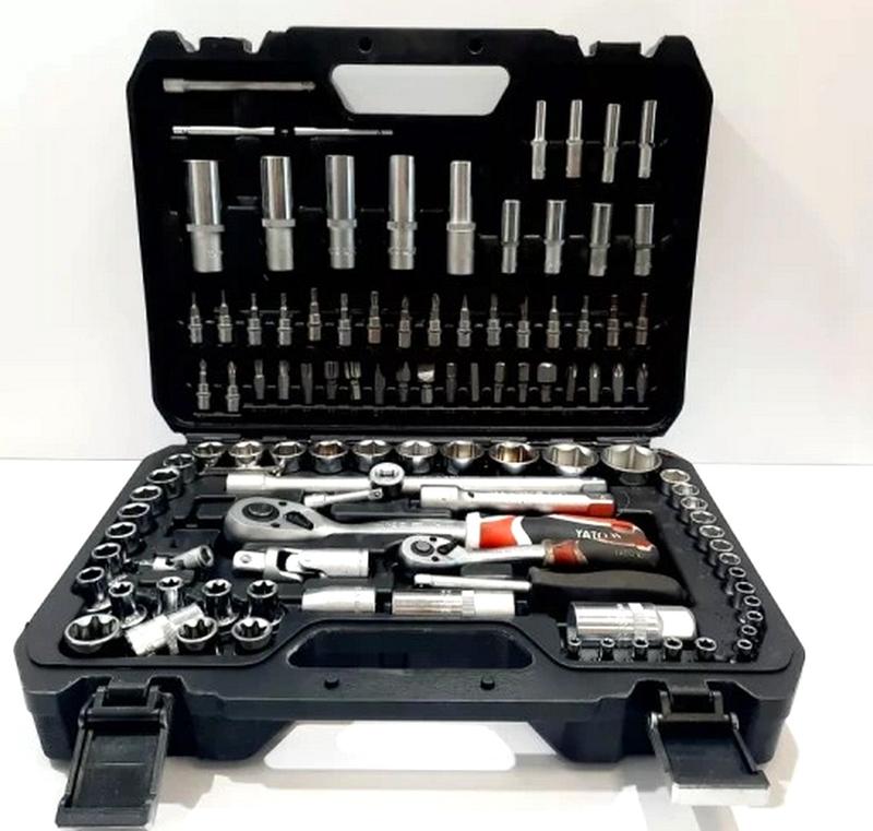 Набор разных ключей, Комплект инструментов для мастеров 108ед YATO (Польша), Набор ключей для ремонта, NST Профессиональный набор инструментов YATO отличается высокими качественными показателями и предназначен для применения в автосервисах, станциях техобслуживания и на производстве. В наборе представлены основные и наиболее востребованные инструменты для выполнения множества сервисных операций, а также работы с резьбовыми соединениями различных видов и сложности. Головки изготовлены методом штамповки, а перед процессом отверждения они калибруются с использованием прецизионных датчиков и контрольных приборов, что обеспечивает абсолютную точность размера. Торцевые головки оснащены шестигранным профилем с технологией AS-Drive, которая увеличивает максимальный крутящий момент на 25%, при этом обеспечивая целостность граней крепежных элементов. В изготовлении инструментов используются такие материалы как хром-ванадиевая, хром-молибденовая сталь, а также сталь марки S2, что гарантирует прочность и долговечность всех элементов. Комплектация набора: - Торцевые головки 6-гр 1/2" - 10, 11, 12, 13, 14, 15, 16, 17, 18, 19, 20, 21, 22, 24, 27, 30, 32 мм, - Торцевые головки 6-гр удлиненные, 76 мм, 1/2 " - 14; 15; 17; 19; 22 мм - Торцевые головки Е-стандарт, 1/2" - E10; E11; E12; E14; E16; E18; E20; E24 - Торцевые головки 6-гр 1/4" гнезда, 25 мм - 4, 4.5; 5; 5,5; 6; 7; 8; 9; 10; 11; 12; 13; 14 мм - Торцевые головки 6-гр удлиненные, 50 мм, 1/4" - 6; 7; 8; 9; 10; 11; 12; 13 мм - Торцевые головки Е-стандарт 1/4" - E4; E5; E6; E14; E7; E8 - Торцевые головки с битами TORX 1/4" - T8; T10; T15; T20; T25; T30 - Торцевые головки с битами Phillips 1/4 " -Ph1; Ph2 - Торцевые головки с битами Pozidriv 1/4" - Pz1; Pz2 - Торцевые головки с битами Sloted 1/4" - 4; 5.5; 7 мм - Торцевые головки с битами HEX 1/4" - 3; 4; 5 - Трещотка 1/2 " на 72 зуба, длина 255 мм - Трещотка 1/4 " на 72 зуба, длина 155 мм - Плавающий вороток, длина 152,4 мм - Ответка под квадрат, длина 150 мм - Удлинители 1/2" - 125 мм, 250 мм - Удлинители 1/4" - 50 мм, 100 мм - Гибкий удлинитель 1/4 " - Карданные шарниры - 1/2 "и 1/4" - Переходник F3/8" x M1/2 " - Адаптер для бит 1/ " - Адаптер для бит - 5/16"х1/2 "" - Биты : - - TORX: T40; T45; T50; T55 - - PHILIPS: Ph3; Ph4 - - POZIDRIV: Pz3; Pz4 - - Sloted: 8; 10; 12 мм - - HEX: 8; 10; 12; 14 мм - Шестигранники - 1,5; 2; 2,5 мм