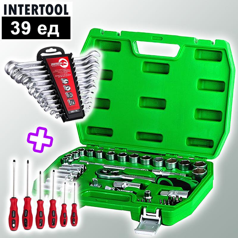 Дорожній набір інструментів 39ед (3/8) + набір ключів 12 шт. + набір викруток 6 шт., NST Комплект складається з 3 елементів: - Набір інструментів INTERTOOL 39 ед. (3/8") - Набір ключів комбінованих INTERTOOL 12 шт. (6-22 мм), CrV - Набір викруток INTERTOOL 6 ед. (SL3*75, SL5*100, SL6*125, PH0*75, PH1*100, PH2*125), CrV Інформація про набір інструментів Набір із комплектацією 39 одиниць містить тріскачку, набір шестигранних головок від 8 до 22 мм, головки середньої довжини 8-19 мм, для роботи з кріпленнями у важкодоступних місцях. Свічкові головки на 16 і 21 мм допоможуть витягти свічки запалювання. Подовжувачі 75, 150 мм і наявність кардану набагато спрощують роботу з кріпленнями зі складним розташуванням у глибині деталей.Бети з різного типу (TORX, PZ, HEX, PH, SL) для побутових робіт також допоможуть під час ремонту бортової техніки в авто. Комплектація - Трещотка 3/8", 72 зуба, реверсионная; - Головка шестигранная 3/8", 14 ед.: 8, 9, 10, 11, 12, 13, 14, 15, 16, 17, 18, 19, 21, 22 мм; - Головка середньої довжини 3/8", 6 од.: 8, 10, 12, 13, 17, 19 мм; - Головка свічкова 3/8", 2 од.: 16, 21 мм; - Подовжувач 3/8", 2 од.: 75, 150 мм; - Кардан 3/8"; - Переходник 3/8"-1/2"; - Адаптер для біт 3/8". - Біти, 11 од. - TORX 3 ед.: T10, T15, T20; - PZ 2 од.: PZ1, PZ2; - HEX 2 од.: 5, 6 мм; - PH 2 од.: PHP, PH2; - SL 2 од.: 4, 5.5 мм. Інформація про набір комбінованих ключів До набору увійшли ріжково-накидні ключі, розмірами: 6, 7, 8, 9, 10, 11, 12, 13, 14, 17, 19, 22 мм. Це дає змогу вибрати потрібний розмір під будь-які завдання з монтажу та демонтажу нарізних з'єднань гайок і болтів. Ключі виготовлені з міцної Cr-V сталі, яка не схильна до руйнування, мають підвищений запас міцності та витримують великі навантаження. Інформація про набір викруток - Довжина викрутки: 75, 100, 125 мм. - Тип насадок: SL3, 5, 6 мм; PH0, PH1, PH2 - Кількість у наборі 6 од. - Тип: ергономічний - Вага 0,538 кг