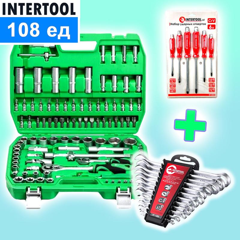Наборы инструмента в чемодане 108ед + 12шт ключей + 6шт ударных отверток, Набор головок и ключей, NST Комплект состоит из 3 позиций: 1. Набор инструментов INTERTOOL 108 ед. (1/2" и 1/4") 2. Набор ключей комбинированных INTERTOOL 12 шт., 6-22 мм CRV 3. Набор ударных отверток INTERTOOL 6 ед. Информация о наборе инструментов Набор включает 108 элементов для решения любой задачи на откручивание, закручивание креплений. Разнообразие торцевых головок в наборе позволяет выполнять подавляющее большинство задач по ремонту автомобиля, а также техники. В комплектацию вошли торцевые шестигранные головки от 4 до 32 мм, позволяющие откручивать крепления разных диаметров. Высокие головки и воротники нужны для откручивания гаек, болтов и шпилек в глубоких колодцах двигателей или в местах, где сложно их достать. В этот набор также добавлены головки Е профиля (TORX, «звездочки»), для того чтобы вы смогли работать с элементами ходовой и двигателя, а также с узкоспециализированными креплениями. Наличие свечных головок на 16 и 21 мм позволяет выкрутить зажигательную свечу в любой машине, а благодаря удлинителям и карданам это можно сделать даже в глубоких колодцах двигателей. Кроме этого в ассортимент набора вошли различные биты, которые пригодятся при ремонте бортовой техники, электроники, мебели и т.д. Комплектация - Трещотка 1/2" 72 зуба, реверсионная; - головка шестигранная торцевая 1/2" 17 ед.: 10, 11, 12, 13, 14, 15, 16, 17, 18, 19, 20, 21, 22, 24, 27, 30, 32 мм; - головка шестигранная продлена 1/2" 5 ед.: 14, 15, 17, 19, 22 мм; - головка торцевая TORX (звезда) 1/2" 8 ед.: Е10, Е11, Е12, Е14, Е16, Е18, Е20, Е24; - удлинитель 1/2" 125 мм; - ворот с плавающей головкой 1/2" 250 мм; - головка свечная 1/2" 2 ед.: 16 мм и 21 мм; - Кардан 1/2". - переходник 1/2" для бит; - Держатель 1/4" для головок и бит 150 мм. Бити: - HEX 5 ед.: 7, 8, 10, 12, 14 мм; - TORX 5 ед.: T40, T45, T50, T55, T60; - PH 2 ед.: PH3, PH4; - PZ 2 ед.: PZ3, PZ4; - SL 3 ед.: 8, 10, 12 мм. - головка с насадкой HEX 1/4" 4 ед.: 3, 4, 5, 6 мм; - головка с насадкой TORX 1/4" 7 ед.: T8, T10, T15, T20, T25, T27, T30; - головка с насадкой SL 1/4" 3 ед.: 4, 5.5, 6.5 мм; - головка с насадкой PH 1/4" 2 ед.: PH1, PH2; - головка с насадкой PZ 1/4" 2 ед.: PZ1, PZ2. - Трещотка 1/4" 72 зуба, реверсионная; - головка шестигранная торцевая 1/4" 13 ед.: 4, 4.5, 5, 5.5, 6, 7, 8, 9, 10, 11, 12, 13, 14 мм; - шестигранная головка продлена 1/4" 8 ед.: 6, 7, 8, 9, 10, 11, 12, 13 мм; - головка торцевая TORX (звезда) 1/4" 5 ед.: Е4, Е5, Е6, Е7, Е8; - удлинитель 1/4" 2 ед.: 50, 100 мм; - ворот 1/4" с плавающей головкой 110 мм; - кардан 1/4"; - Г-образные шестигранные ключи 3 ед.: 1.5, 2, 2.5 мм. Информация о комбинированных ключей 12 шт. В наборе рожково-кидочные ключи, размерами: 6, 7, 8, 9, 10, 11, 12, 13, 14, 17, 19, 22 мм. Это позволяет выбрать требуемый размер под любые задачи для монтажа и демонтажа резьбовых соединений гаек и болтов. Ключи изготовлены из прочной Cr-V стали, не подверженной разрушению, имеют повышенный запас прочности и выдерживают большие нагрузки. Информация о наборе ударных отверток 6 ед Набор используется для откручивания ржавых и прикипелых винтов и саморезов. Этот тип отверток в большинстве своем предназначен для бытового использования, хотя и в других производственных отраслях эти отвертки себе зарекомендовали положительным образом. Отверточные хвостовики изготовлены из хром-ванадиевой стали, которая обеспечивает высокие эксплуатационные показатели и защиту от коррозии. В наборе 6 отверток с насадками SL5, SL6, SL8; PH1, PH2, PH3. Особенности - Отверточные хвостовики сделаны из хром-ванадиевой стали, что делает инструмент прочным и надежным, с антикоррозио