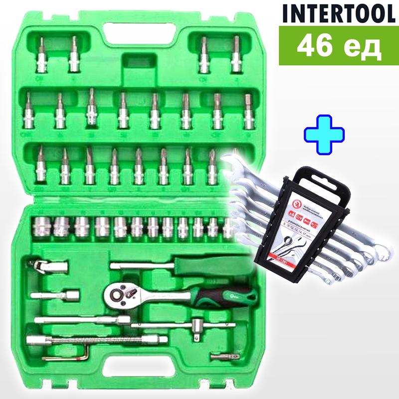 Набор ключей для автомобилиста, Набор ключей для авто с трещоткой 46ед (1/4) + набор ключей 6шт, NST Комплект состоит из: 1. Набор инструментов INTERTOOL 46шт, 1/4" (Размер головок 4-14 мм, Квадрат 1/4", Габаритные размеры 260х180х70 мм) 2. Набор комбинированных ключей INTERTOOL 6 ед., 8-17 мм Cr-V (Размерная линейка набора -- 8; 10; 12; 13; 14; 17 мм) Информация о наборе инструментов Набор инструментов состоит из 46 единиц с рабочим квадратом 1/4". Оптимален для выполнения "мелких" работ по дому или ремонту автомобиля. Надежен и долговечен. Все насадки изготовлены из высокопрочной хром-ванадиевой стали, что обеспечивает высокие эксплуатационные характеристики, а также защиту от коррозии. Набор укомплектован в удобный пластиковый кейс. Наличие большого набора торцевых головок и отверточных бит делает набор пригодным для широкого спектра работ. Благодаря строгому соблюдению технологии производства, весь инструмент характеризуются точностью и отсутствием дефектов. Комплектация - Трещоточная рукоятка 1/4", 72 зуба, реверсионная; - Головка шестигранная торцевая 1/4", 13 шт.: 4, 4.5, 5, 5.5, 6, 7, 8, 9, 10, 11, 12, 13, 14 мм; - Удлинитель 1/4" 50, 100 мм; - Гибкий удлинитель 150 мм; - Вороток 115 мм; - Кардан 1/4"; - Адаптер для шуруповерта 1/4"; - Держатель 1/4" для головок и бит 150 мм. Биты: - TORX 6 шт.: T10, T15, T20, T25, T30, Т40; - HEX 6 шт.: 3, 4, 5, 6, 7, 8 мм; - PH 3 шт.: PH1, PH2, PH3; - PZ 3 шт.: PZ1, PZ2, PZ3; - SL 3 шт.: SL4, SL5.5, SL7. Информация о комбинированных ключей Набор из 6 комбинированных ключей, каждый из которых представляет собой сочетание рожкового и накидного гаечного ключа. Размерная линейка набора -- 8; 10; 12; 13; 14; 17 мм. Обе стороны ключей имеют одинаковый размер головки. Рожковая сторона ключей является самой популярной среди соединений и имеет обширную область применения. Накидная сторона ключей, благодаря кольцевому строению, в момент приложения усилия позволяет распределить нагрузку равномерно. Это снижает риск «слизать» грань угла. Ключи изготовлены из хром-ванадиевой стали. Её физические и химические свойства обуславливают высокую устойчивость к механическим нагрузкам, коррозионную стойкость и твердость. Кроме того, эта легированная сталь обладает благоприятным модулем упругости. Удобная форма ключа обеспечивает оптимальные условия для приложения усилия. Ключи поставляются в удобном пластиковом держателе с ручкой и отверстием для подвешивания.
