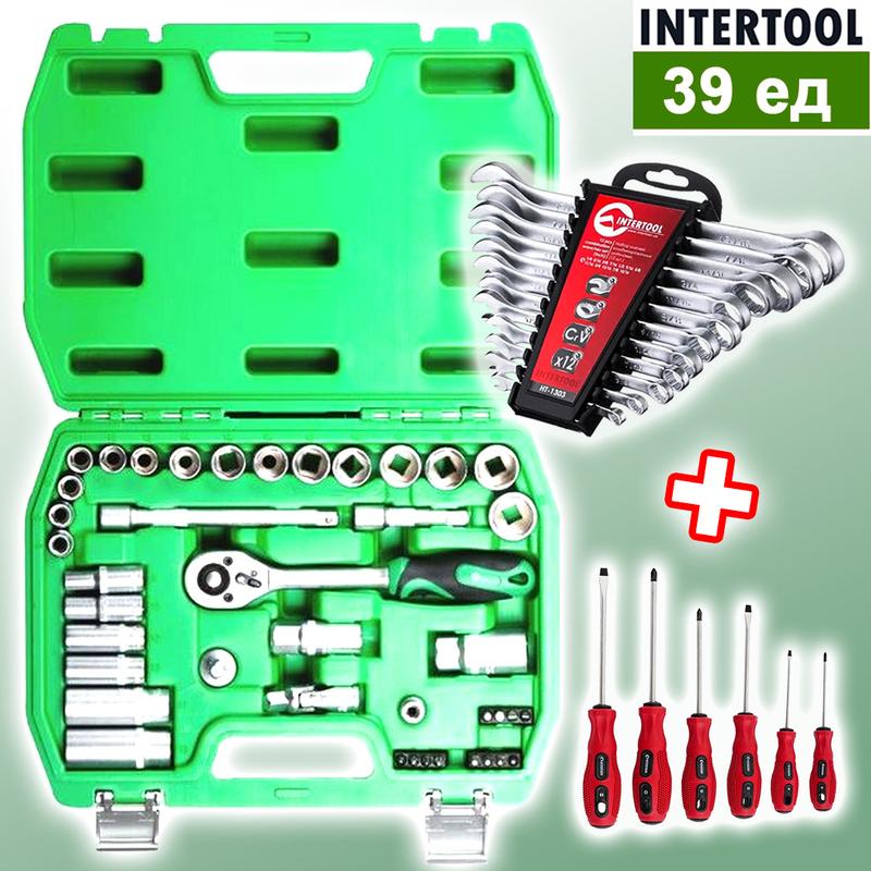 Большой набор инструмента, Большой набор головок 39ед (3/8) + набор ключей 12шт + набор отверток 6шт, NST Комплект состоит из 3х элементов: - Набор инструментов INTERTOOL 39 ед. (3/8") - Набор ключей комбинированных INTERTOOL 12 шт. (6-22 мм), CrV - Набор отверток INTERTOOL 6 ед. (SL3*75, SL5*100, SL6*125, PH0*75, PH1*100, PH2*125), CrV Информация о наборе инструментов Набор с комплектацией в 39 единиц включает в себя трещотку, набор шестигранных головок от 8 до 22 мм, головки средней длины 8-19 мм, для работы с креплениями в труднодоступных местах. Свечные головки на 16 и 21 мм помогут извлечь свечи зажигания. Удлинители 75, 150 мм и наличие кардана намного упрощают работу с креплениями со сложным расположением в глубине деталей.Бети из разного типа (TORX, PZ, HEX, PH, SL) для бытовых работ также помогут при ремонте бортовой техники в авто. Комплектация: - Трещотка 3/8", 72 зуба, реверсионная; - Головка шестигранная 3/8", 14 ед.: 8, 9, 10, 11, 12, 13, 14, 15, 16, 17, 18, 19, 21, 22 мм; - Головка средней длины 3/8", 6 ед.: 8, 10, 12, 13, 17, 19 мм; - Головка свечная 3/8", 2 ед.: 16, 21 мм; - Удлинитель 3/8", 2 ед.: 75, 150 мм; - Кардан 3/8"; - Переходник 3/8"-1/2"; - Адаптер для бит 3/8". - Биты, 11 ед. - TORX 3 ед.: T10, T15, T20; - PZ 2 ед.: PZ1, PZ2; - HEX 2 ед.: 5, 6 мм; - PH 2 ед.: PH1, PH2; - SL 2 ед.: 4, 5.5 мм. Информация о наборе комбинированных ключей В набор вошли рожково-накидочные ключи, размерами: 6, 7, 8, 9, 10, 11, 12, 13, 14, 17, 19, 22 мм. Это позволяет выбрать необходимый размер под любые задачи по монтажу и демонтажу резьбовых соединений гаек и болтов. Ключи изготовлены из прочной Cr-V стали, не подверженной разрушению, имеют повышенный запас прочности и выдерживают большие нагрузки. Информация о наборе отверток - Длина отвертки: 75, 100, 125 мм. - Тип насадок: SL3, 5, 6 мм; PH0, PH1, PH2 - Количество в наборе 6 ед. - Тип: эргономичный - Вес 0,538 кг