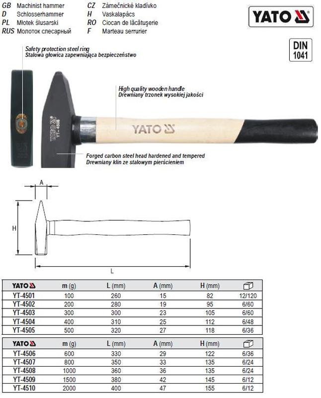 Молоток слюсарний din 1041 m=12000 г l=400 мм yato yt-4510