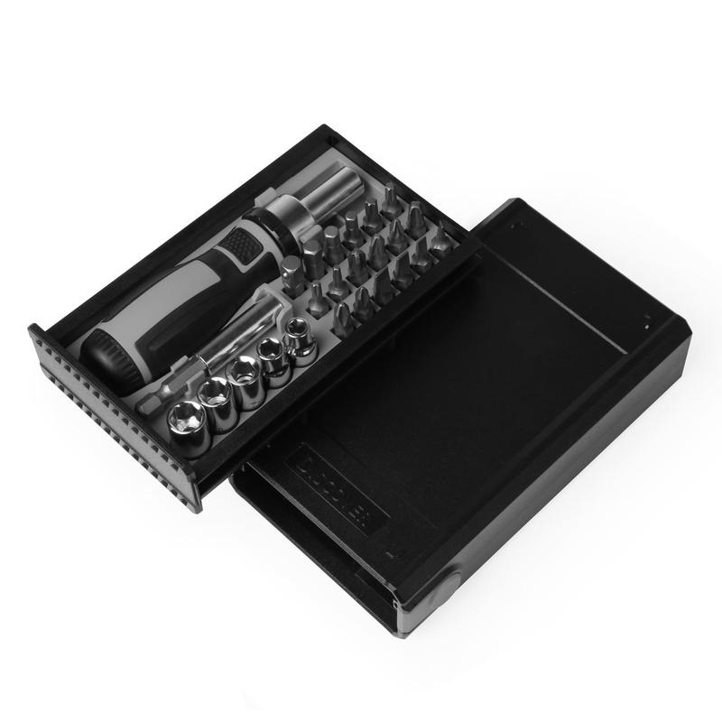Набір з високоякісної сталі в компактній, пластиковій коробці, яка оригінально відкривається натиском на кнопку. В комплект входить 25 шт інструментів: Викрутка з тресчіткою 1 шт. Магнітний тримач 1 шт. 17 біт (6,35 x 25 мм): 3 мм, 4 мм, 5 мм, 6 мм, PH1, PH2, PH3, PZ1, PZ2, PZ3, T10, T15, T20, T25, H4, H5, H6 1шт ADP адаптор 5 шт. 1/4" головки: 5 мм, 6 мм, 7 мм, 8 мм, 9 мм. Розмір набору 14,5 х 8,5 х 3,5 см. Нанесення тамподрук, уф-друк, об'ємна смоляна наліпка.