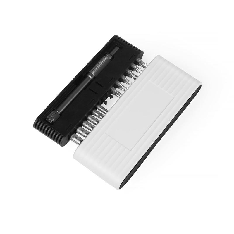 Міні-набір з високоякісної сталі в компактній, пластиковій коробці. В комплект входить 19 шт інструментів:1шт викрутка12 шт. Біт (4 x 28 мм):1.0, 1.5, 2.0, PH000, PH00, PH0, T4, T5, T6, T8, H1.5, H2.06 біт для гайок:2,5 мм, 3,0 мм, 3,5 мм, 4,0 мм, 4,5 мм, 5,0 мм. Розмір набору 13,5 х 5,2 х 2,2 см. Нанесення тамподрук,уф-друк, об'ємна смоляна наліпка .