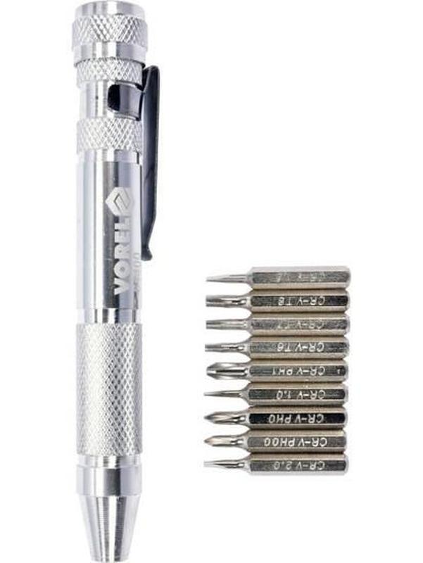 Отвертка реверсивная VOREL-64400 + 9 насадок - вещь, которая должна быть в рабочем арсенале любого мастера. Этот набор позволяет производить широкий спектр работ. Материалы высокого качества обеспечивают долговечность и надежную работу. В набор входит: отвертка; биты Phillips: PH00, PH0, PH1; биты плоские: 1 мм, 1,5 мм, 2 мм; биты Torx: T6, T7, T8. - материал CrV - магнит - длина 120 мм - тип точный, с битами - размер держателя инструмента 5/32 дюйма (4,0 мм) - наконечник шлиц, Phillips (PH), Torx - количество в наборе 10 штук