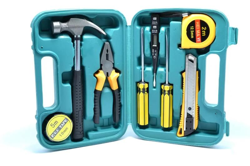 Характеристики и описание Данный набор поставляется в кейсе, что делает хранение и транспортировку инструментов удобной и функциональной. В набор входит Молоток Пассатижи Отвертка 2шт (шлица и крест) Рулетка 2 метри Пробник Нож канцелярский Изолента 5 метров Кейс пластиковый