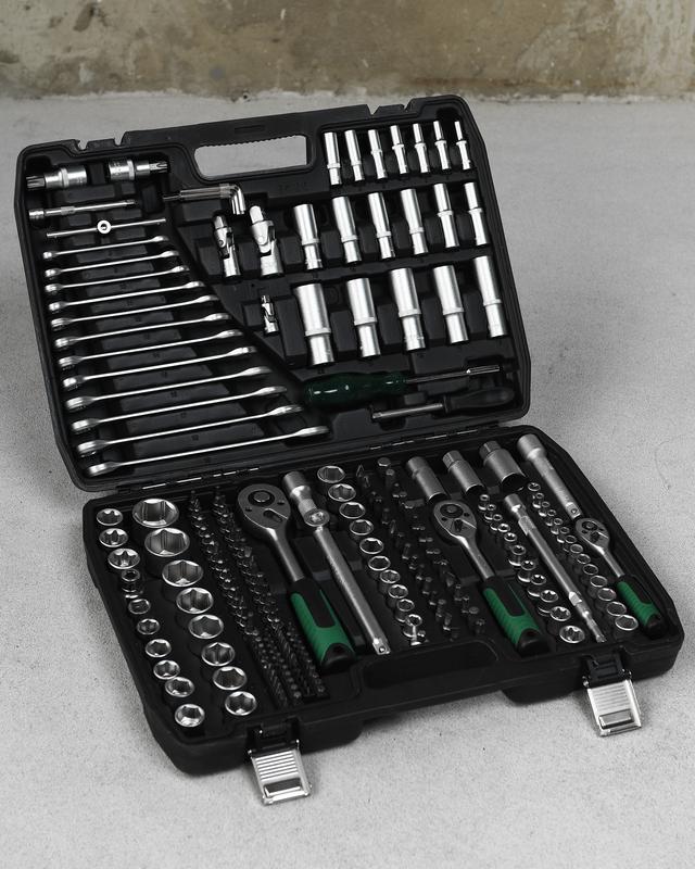 Набор головок инструментов 216 элементов Инструменты изготовлены из хрома ванадиевой стали Комплектация Насадки 1/2": 10; 11; 12; 13; 14; 15; 17; 19; 20; 21; 22; 24 мм, L= 38 мм; 27; 30; 32 мм, L= 42 мм Насадки удлиненные 1/2": 16; 17; 18; 19; 22 мм, L= 76 мм Насадки 1/2" torx: E20; E22; Е24 Насадки 3/8": 10; 11; 12; 13; 14; 15; 16 мм, L=28 мм; 17; 18; 19 мм, L=30 мм Насадки удлиненные 3/8": 10; 11; 12; 13; 14; 15 мм, L= 63 мм. Насадки 3/8" torx: E10; E11; E12; E14; E16; E18 Насадки 1/4": 4; 4.5; 5; 5.5; 6; 7; 8; 9; 10; 11; 12; 13; 14 мм, L= 25 мм Насадки удлиненные 1/4": 4; 5; 6; 7; 8; 9; 10 мм, L= 50 мм Насадки 1/4" torx: E4; E5, E6; E7; E8 Трещотка 1/2": 72T, 255 мм Трещенка 3/8": 72T, 200 мм Трещенка 1/4": 72T, 155 мм Вороток передвижной: 1/2", L=255 мм; 1/4", L=152,4 мм Отвертка для бит 1/4", L=150 мм Отвертка 1/4" с наконечником для битУджинник 1/2": 125 мм 250 мм Длина 3/8": 575 мм; 150 мм Длина 1/4": 50 мм; 100 мм Насадки для свечей 1/2" 16; 21 мм Насадки для свечей 3/8" 18 мм Универсальный шарнир: 1/2", 3/8" и 1/4" Адаптер для бит 5/1" z 1/2" Адаптер для бит 5/16" z 3/ 8"" Биты 5/16": 30 шт Бити 1/4": 44 шт Биты Torx на насадке 1/4": T8; Т10 х2; Т15 х2; Т20 х2; Т25 х2; T40 Биты Torx на насадке 1/2": T55; T60 Биты крестовые Philips на насадке 1/4": Ph1; Ph2 Биты крестовые Pozidriv на насадке 1/4": Pz1; Pz2 Бити плоскі на насадці 1/4": 4; 5,5; 7 мм Бити шестигранні на насадці 1/4": 3; 4; 5; 6 мм Рожковые ключи: 8; 9; 10; 11; 12; 13; 14; 15; 16; 17; 18; 19; мм Ключи имбусовы: 1.27; 1.5 2,5; 5 мм Цена 3450грн