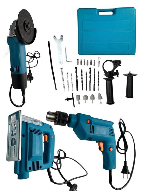 Набір інструментів 3в1. Дриль, лобзик, болгарка в наборі. Дриль - потужність 680 Вт. Кількість оборотів - 2800 об/хв. Діаметр патрона - 13 мм. Вага інструменту - 2 кг. Лобзик - потужність 450 Вт. Кількість оборотів - 3100 об/хв. Вага інструменту - 2 кг. Болгарка - потужність 840 Вт. Кількість оборотів - 11000 об/хв. Діаметр диска - 125 мм. Вага інструменту - 2.1 кг. Упаковка – пластиковий кейс.
