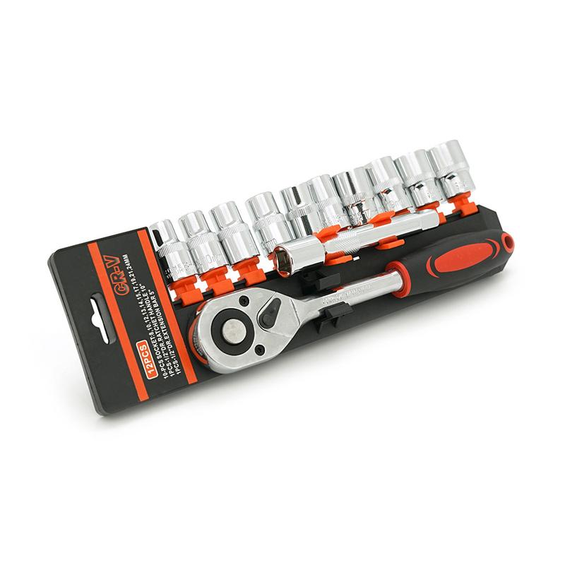 Набір інструментів представлений 12-ма позиціями з робочим квадратом 1/2. Даний набір підходить для ремонту автомобіля або для виконання робіт по дому. Інструменти виготовлені з якісних матеріалів із захистом від корозії, тому прослужать вони довго і щасливо! Комплектація набору; * 10 шт. - торцеві головки шестигранні (10,11,12,13,14,15,17,19,21,22 мм) * 1 шт. - пластиковий тримач для головок * 1 шт. - подовжувач 125 мм * 1 шт. - тріщотка 250 мм
