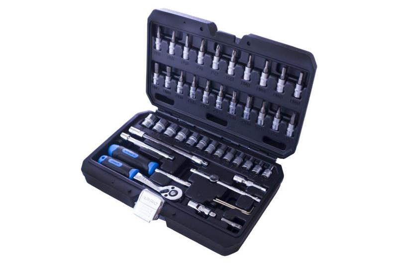 Набор инструмента Apro – компактный и практичный для использования в авто. Такой набор удобно держать под рукой, он не занимает много места в салоне и очень функциональн. В наборе представлены наиболее популярные размеры бит, насадок, трещотка, а также Т-образный ворот 115 мм. Биты – ТХ: 10, 15, 20, 25, 30, 4; НЭХ: 3, 4, 5, 6, 7, 8; РН: 1, 2, 3; FD: 4, 5,5, 7 мм. Удлинитель: 50, 100 мм, 150 мм гибкий. Вороток: Т-образный 115 мм; 1,27, 1,5, 2, 2,5 мм. Насадки 1/4: 4, 4.5, 5, 5.5, 6, 7, 8, 9, 10, 12, 13, 14 мм.