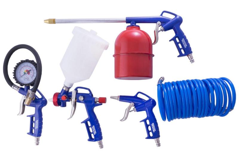 Применяется для профессионального нанесения лакокрасочных материалов на поверхности из пластика, металла, дерева, керамики и других материалов. Включает 5 предметов: соединительный шланг; пистолет для продувки; пневмозатвор с монометром; краскораспылитель пневматический с верхним бачком; пистолет для промывки поверхностей сильной струей и смазки.