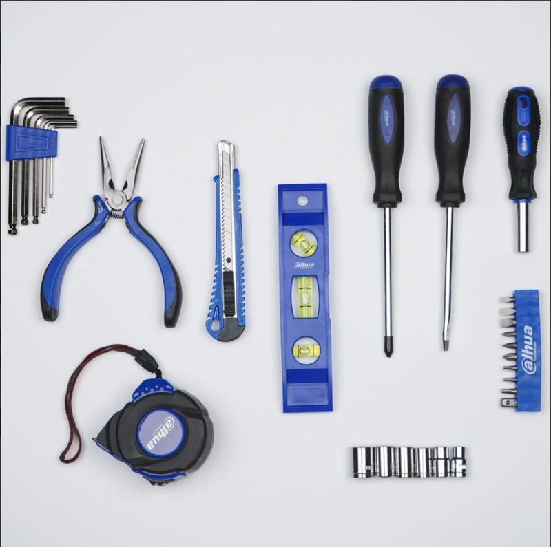 Високоякісний набір інструментів Dahua, що буде корисний як для монтажника систем відеоспостереження, охоронних систем та контролю доступу так і для майстра по ремонту комп'ютерної чи офісної техніки, мобільних телефонів. Набір складається з: рулетка 3м, набір шестигранників 2-6мм, довгогубці, набір 6-гранних головок 6-11мм, ніж, рівень з магнітною платформою, викрутка хрестова, викрутка щілинна, тримач біт, набір з 6 біт, набір для ремонту електроніки: тримач + 48 дрібних насадок.