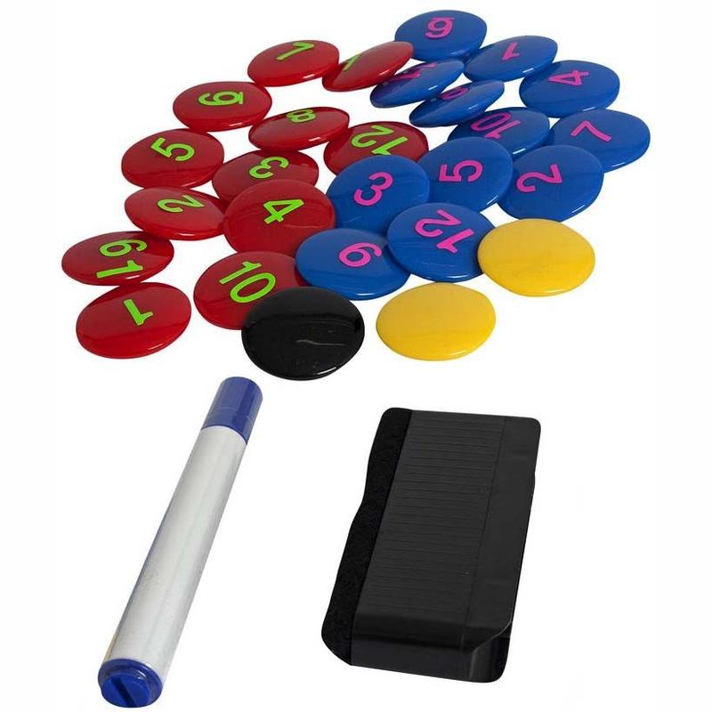 • Комплектация: магнитные фишки с нанесенной нумерацией - 12 красных, 12 синих, 2 желтые и 1 черная, маркер, губка для стирания • Цвет: красный/желтый/синий (340) • Материал: поливинилхлорид • Особенности: Дополнительный комплект для тактических досок. • Страна-производитель: Тайвань
