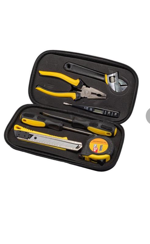 Инструментальная сталь soft кейс. Нож пластиковый 18 мм измерительная рулетка 3м х 18 мм отвертка SL5 х 75 мм, отвертка PH2 х 75 мм ключ разводной 150 мм плоскогубцы 160 мм тестер с ЖК дисплеем