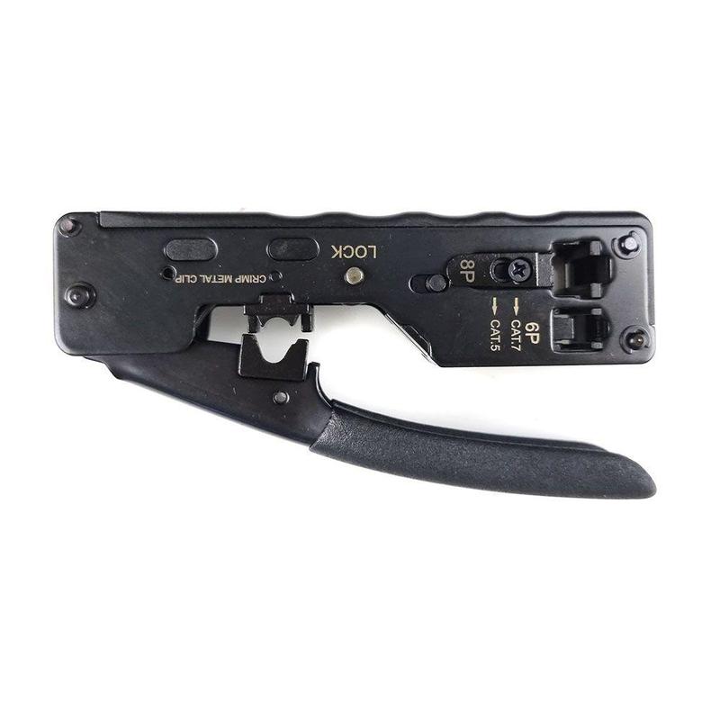Крімпер від компанії EServer призначений для надійного обтиску провідників витої пари. Модель оснащена гніздами під конектори прохідного типу 6P і 8P. Вона підходить для опресування кабелю роз'ємами RJ11, RJ12 і RJ45 п'ятої та сьомої категорій. Обжимний інструмент чорного кольору міцно зібраний, тому відрізняється довговічністю. Крімпер оснащений храповим механізмом для фіксації та зниження навантаження на руку користувача. Ручка обтискача має спеціальне покриття, що не вислизає з руки. Це робить роботу з інструментом більш комфортною.