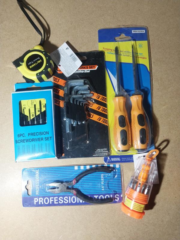 Набір інструментів. До набору входить: Набір біт (15 шт) Рулетка (3м) Набір викруток для точної механіки (6 шт) Бокорізи Набір Г-подібних ключів (9шт) Набір викруток на підвісі , малі 2 шт.