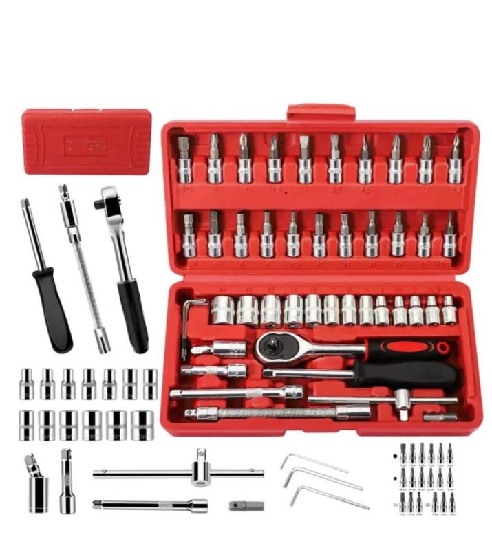 Набор инструментов 46 элементов должен быть в арсенале любого мужчины. В его комплекте идет трещотка, отвертка и множество различных бит и торцевых головок. Набор упакован в прочный пластиковый кейс, в котором удобно его транспортировать.
