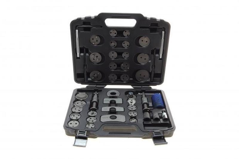 Набор инструмента для разведения тормозных цилиндров - это комплект специализированных инструментов, разработанный для эффективного разведения тормозных цилиндров при обслуживании и ремонте тормозной системы автомобиля. Тормозные цилиндры отвечают за сжатие тормозных колодок, что обеспечивает процесс торможения. Набор может включать в себя различные инструменты, такие как расширители, наборы адаптеров и фиксаторов, специальные ключи и ручки, которые помогают удобно и эффективно разводить тормозные цилиндры разных размеров и конструкций. Они обеспечивают правильную разводку цилиндров, что позволяет удобно устанавливать новые тормозные колодки или проводить обслуживание.