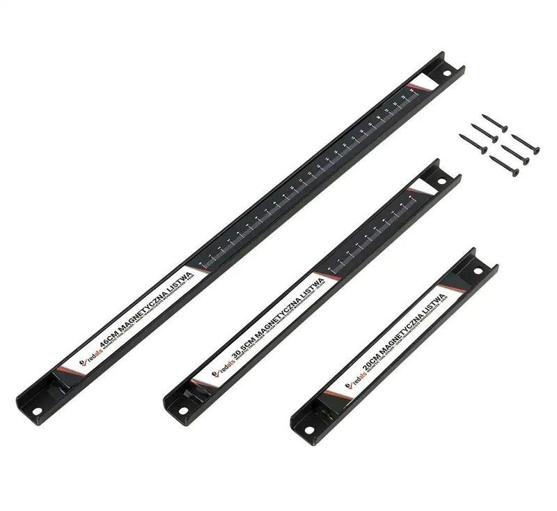 Магнитная лента для инструментов, набор 3 шт. – 20 см/30,5 см/46 см REDATS Этот набор магнитных лент – идеальное решение для организации инструментов в гараже, мастерской или на рабочем месте. Благодаря сильному магнитному покрытию, вы сможете надежно закрепить инструменты, что поможет поддерживать порядок и всегда иметь их под рукой. Комплектация: 3 магнитные рейки для инструментов: Рейка 1: длина 20 см, ширина 23 мм Рейка 2: длина 30,5 см, ширина 23 мм Рейка 3: длина 46 см, ширина 23 мм 6 винтов для монтажа (диаметр 3,5 мм) Применение: Эти магнитные рейки удобно использовать для хранения инструментов, таких как: Плоские отвертки Молоты Отвертки Плоскогубцы И другие инструменты Как установить: Просто прикрепите рейки к поверхности с помощью винтов, которые идут в комплекте. Легко и быстро можно организовать пространство, имея под рукой все необходимые инструменты. Этот набор магнитных лент – отличный способ поддерживать порядок и удобство на рабочем месте.
