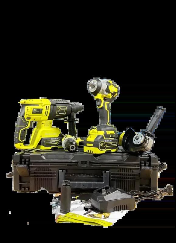 Набор аккумуляторных инструментов FGT SET G4 включает 4 позиции инструментов, которые удачно сочетаются между собой в работе и становятся помощниками No1 в работе многих отраслей. 1. Аккумуляторный гайковерт FGT FTW550 - передовое решение для профессионального и бытового использования в сфере монтажных или автообслуживающих работ. Имея передовые характеристики и удобный дизайн, он станет вашим незаменимым помощником на строительстве, в гараже или на производстве. Характеристики: - Напряжение аккумулятора: 20 В - Крутящий момент: 550 Нм - 3 режима усилий (0-1800 | 2600 | 3400 уд/мин) - Электронная регулировка оборотов (0-2800 об/мин) - Количество режимов работы: 3 - Тип двигателя: Бесщеточный (Brushless) - Тип патрона: 1/2'' квадрат 2. Аккумуляторный перфоратор FGT FGH201 - обладая передовыми характеристиками и удачным дизайном, он станет вашим незаменимым помощником на строительстве или на производстве. Предназначен для сверления, бурения и долбления. Аппарат оснащен функцией реверса. Ограничитель глубины поможет высверлить отверстие точного размера без повреждения обрабатываемой поверхности. Модель имеет фиксатор кнопки запуска, регулятор частоты вращения. Практичный и легкий, мощный и экономичный перфоратор позволит справиться с любыми нагрузками. Характеристики: - Напряжение аккумулятора: 20 В - Сила удара: 2,8 Дж - Количество оборотов: 0-850 об/мин - Количество ударов: 0-5900 уд/мин - Диаметр сверления: 13/26/30 мм - Количество режимов работы: 3 - Тип патрона: Быстрозажимной - Тип двигателя: Бесщеточный 3. Аккумуляторная угловая шлифмашина FGT FAG203 - отличная болгарка для бытовых нужд, справится с резкой, шлифовкой, полировкой различных материалов. Мощный двигатель позволяет развивать до 9800 оборотов в минуту. Обладает высоким уровнем безопасности благодаря защитному кожуху. Корпус угловой шлифмашины отличается термостойкостью и ударопрочностью, что обеспечивает долговечность устройства даже при тяжелых условиях эксплуатации. Характеристики: - Тип двигателя: бесщеточный - Напряжение аккумулятора: 20 В - Количество оборотов: 3000-8500 об/мин - Диаметр диска: 125 мм - Регулировка оборотов: Да - Плавный пуск: Да - Защита от закусывания: Да 4. Аккумуляторный шуруповерт FGT CD255M - универсальная и наиболее удачная модель шуруповерта для разных видов работ. Быстрозажимной патрон позволяет быстро менять сверла без дополнительных инструментов, экономя время и усилия. Используется для сверления таких материалов как дерево, бетон и камень, а также для затяжки или ослабления винтов. Подходит для сборки мебели, замены осветительных приборов и сверления в гипсокартоне. Модель оснащена металлическим патроном и светодиодным освещением. Небольшие габариты позволяют работать в труднодоступных местах. Характеристики: - Тип двигателя: бесщеточный - Напряжение аккумулятора: 20 В - Крутящий момент: 55 Нм - Количество скоростей работы: 2 - Количество оборотов холостого хода: **************б/мин - Тип патрона: металлический одномфтовой быстрозажимной - Диаметр патрона: 1.0 - 13 мм Комплект поставки: 1. - аккумуляторный гайковерт FGT FTW550; 2. - аккумуляторный перфоратор FGT FGH201; 3. - аккумуляторная угловая шлифмашина FGT FAG203; 4. - аккумуляторный шуруповерт FGT CD255M; 5. - аккумуляторная батарея FGT В2040х2; 6. - зарядное устройство FGT CH202; 7. - кейс для инструментов FGT MacPack C2; 8. - картонная упаковка.