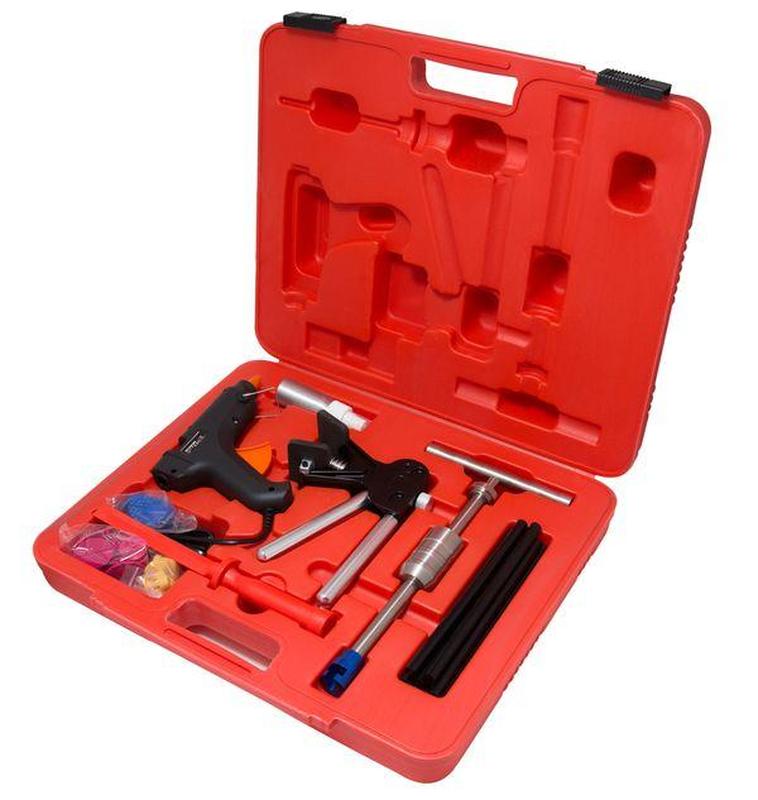 Набор инструментов для безпокрасочного удаления вмятин с термопистолетом 32пр., в кейсе Forsage F-915M1B Комплектация:Клеевой пистолет.Клеевые стержни .Надставки.Обратный молоток.Приспособление для отжима вмятины.Пластиковый нож и др. Профессиональный инструмент для удаления вмятин на разных частях кузова легковых автомобилей, грузовиков и прочих тонкометаллических поверхностей. Применяется для неглубоких вмятин, больших пологих вмятин, точечных вмятин или в виде полосы. Отлично подходит для удаления ямок от града на кузове автомашины. Позволяет аккуратно и профессионально исправить повреждение тонкометаллической поверхности без разборки автомобиля (или другого изделия) и без повреждения лакокрасочного покрытия.