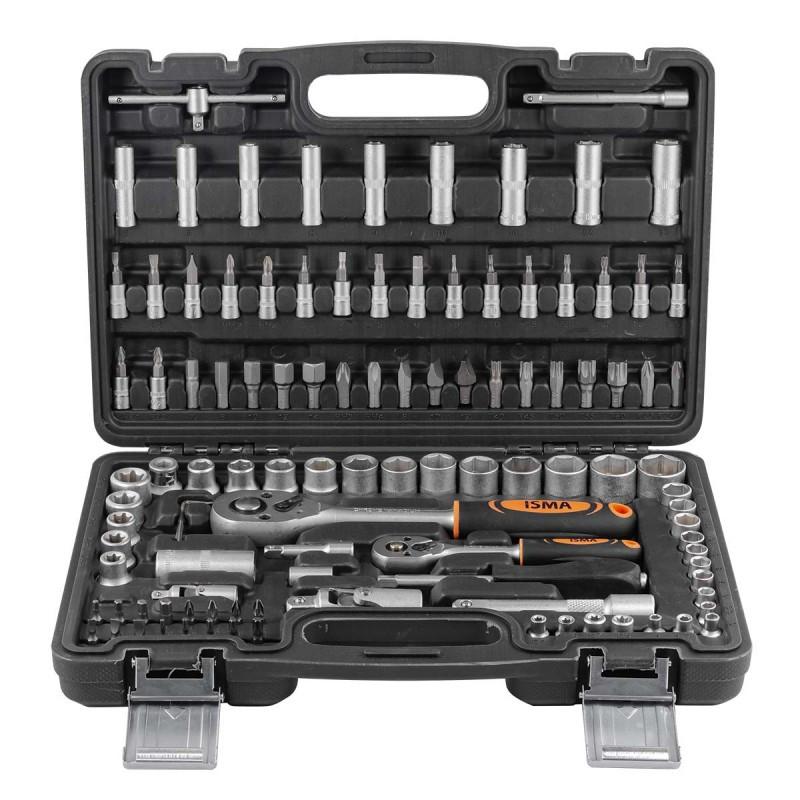 Набор инструментов ISMA IS-41082-5, 1/2 и 1/4 дюйма, упакован в пластиковый кейс и состоит из 108 предметов из стали CrV-группы, предназначенных для монтажа и демонтажа резьбовых крепежей с разными типами шлицев. В комплект входят карданы, удлинители и переходники, облегчающие работу в труднодоступных местах. Набор используется для ремонта автомобилей, а также полезен в быту.НабірПосадочный квадрат 1/4":- Головки 12 шт.(4-13 мм),- головки глубокие 50 мм 9 шт.(5-13 мм),- головки Torx 4 шт.(Е5, Е6, Е7, Е8),- головки-биты 18 шт.(HEX, SL, PH, Torx, PZ),- трещотка,- удлинитель 2 шт.(3", 4"),- вороток Т-образный,- кардан,- рукоятка-битодержатель под вороток,- ключи Г-образные 6-гранные 3 шт.(1.5, 2, 2.5 мм).Посадочный квадрат 1/2":- головки 12 шт.(10-32 мм),- головки Torx 5 шт.(Е10, Е12, Е14, Е16, Е18),- кардан,- трещотка,- битодержатель 2 шт. (1/4", 1/2"),- удлинитель 5",- головка свечная 16 мм,- биты 5/16" 30 мм 17 шт. (HEX, SL, PH, Torx, PZ),- биты 25 мм 16 шт. HEX, SL, PH, Torx, PZ).- Кейс.Особенности- 108 предемтов (торцевые головки, биты, карданные шарниры, удленители и пр.)- Посадочные квадраты: 1/2", 1/4" - Материал: CR-V