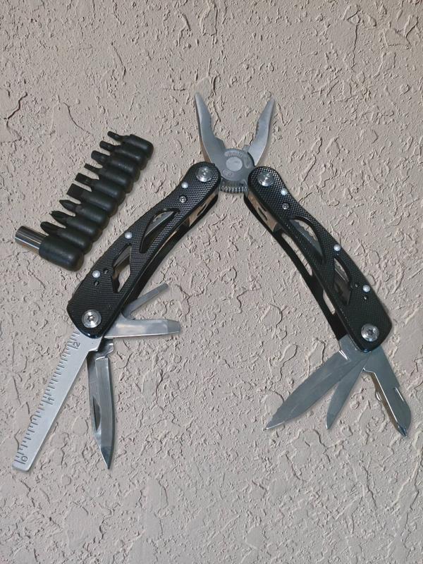 Компактный мультитул с 9 функциями: напильник, шило, инструмент для снятия изоляции,открывалка для бутылок, кусачки для проволоки,линейка и много других полезных насадок Надёжный помощник, который всегда под рукой в ситуациях когда нужен быстрый ремонт, подстройка или помощь в быту, походе + В комплекте идёт нейлоновый чехол с липучкой для хранения и 9 насадок 9 функций: * Напильник с алмазным напылением *Инструмент для снятия изоляции *Держатель для больших бит *Держатель для малых бит *Открывалка для бутылок *Кусачки для проволоки *Средняя отвертка *Консервный нож *Плоскогубцы *Линейка Размер 10,5х5 см помещается в карман,сумку или бардачок