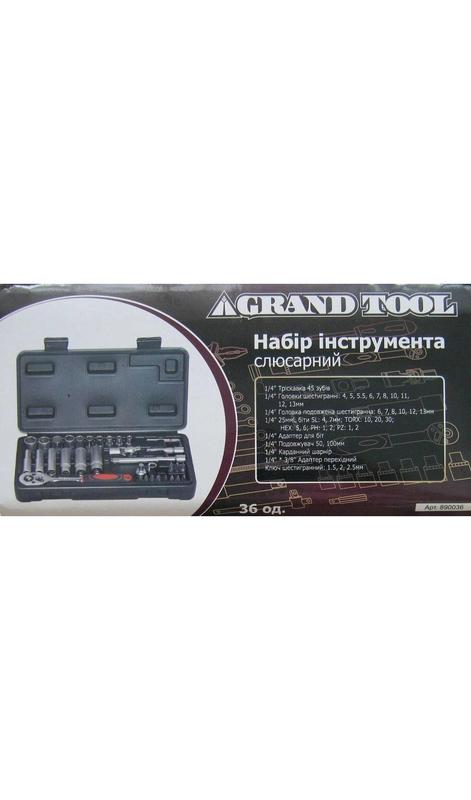 Набор инструментов GRAND TOOL 36ед (1/4 головки, биты, аксессуары) CrV Профессиональный набор инструмента GRAND TOOL включает 36 инструментов в пластиковом кейсе. В состав данного набора входит 10 торцевых головок диаметром от 4 до 13 мм, 2 головки для свечей зажигания, 1 ключ с трещоткой и др. Используемый размер квадрата – 1/4". Профессиональный набор инструмента GRAND TOOL включает инструменты, изготовленные из хром-ванадиевой стали исключительно высокого качества, которая отличается надежностью и долговечностью. Кроме того, стоит отметить наличие антикоррозийного покрытия, также продлевающего срок службы инструмента Набор инструмента: 36 ед. 1/4" GRAND TOOL Комплект торцевых головок, в который входит: - трещотка с быстрым сбросом 1/4", - 10 торцевых головок розмерами: 1/4" 4-5-5,5-6-7-8-10-11-12-13, - 6 торцевых высоких головок розмерами 1/4": 6-7-8-10-12-13, - ползунок 1/4" (который можно использовать как вороток), - 11 насадок бит под отвертку, - 2 удлинителя 1/4" розмерами 50, 100мм, - кардан торцевой шарнирный 1/4", - переходник адаптор под биты 1/4", - три 6-ти гранных ключа размерами 2-2,5-3.