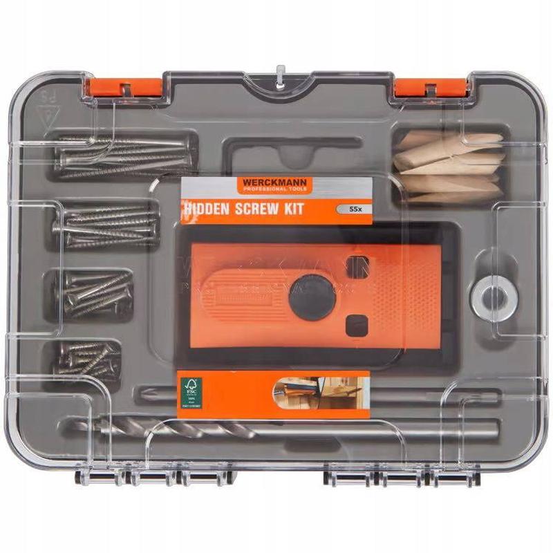 Универсальный набор Werckmann из 55 элементов -- это практичное решение для мастеров и домашних работ. В комплект входят все необходимые инструменты и крепления для сверления, сборки мебели или мелких ремонтных работ. Набор содержит сверло, ограничитель глубины, шестигранный ключ, отвертку, деревянные заглушки и различные размеры шурупов из нержавеющей стали. Древесина элементов имеет сертификат FSC®, подтверждающий экологическое и ответственное происхождение материала. Благодаря удобному шаблону набор обеспечивает точность и простоту в использовании. Характеристики: • 55 элементов в наборе • Удобный шаблон для точного сверления • Сверло ступенчатое HSS 9,5 мм • Ограничитель глубины 9,5 мм • Шестигранный ключ 2,5 мм (CRV) • Отвертка с насадкой 150 мм (S2) • 10 деревянных заглушек (бук, 9,3×46 мм) • Шурупы из нержавеющей стали: 4×25 мм, 4×30 мм, 4×40 мм, 4×60 мм • Сертифицированная древесина FSC®