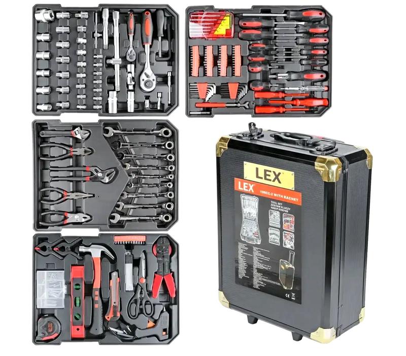Набор инструментов для точной механики 186ед LEX (Польша), Автомобильные ключи, NST Набор инструментов LEX состоит из 186 единиц с рабочими квадратами 1/2 и 1/4. Набор крайне практичен и надежен в эксплуатации. Насадки и инструменты изготовлены из высокопрочной хром-ванадиумной стали, что обеспечивает высокие эксплуатационные характеристики, а также защиту от коррозии. Благодаря строгому соблюдению технологии производства, весь инструмент характеризуются точностью и отсутствием дефектов. Особенности: - Обширный набор инструментов для дома или мастерской. - Все инструменты набора изготовлены из хром-ванадиевого сплава. - Весь инструмент отличается высокой точностью. - Антикоррозийная обработка инструментов. - Чемодан имеет колеса и телескопическою ручку. - Инструмент изготовлен изготовлен из хром ванадиевой стали. Комплектация: Первый ящик: - ключи рожково накидные с трещоткой: 6; 8; 10; 11; 12; 13; 14; 15; 17 мм; - плоскогубцы; - лягушонок; - ключ шведский разводной; - щипцы; Второй ящик: - торцевые ключи + ручки и удлинители 1/4"; - удлинитель 1/4 (2шт. -50 и 100 мм); - удлинитель 1/2 (1шт. - 120 мм); - универсальный шарнир 1/4 и 1/2; - удлинитель гибкий (гибкая) 150 мм.; - регулятор Т; - трещотка 1/4 и 1/2; - ручка отвертки; - насадки 1/4 (4; 4,5; 5; 5,5; 6; 6,5; 7; 7,5; 8; 9; 10; 11; 12; 13; 14 мм.); - насадки 1/2 (7;8; 9; 10; 11; 12; 13; 14; 15; 16; 17; 18; 19; 20мм.); - наконечники свечей зажигания 16 мм и 21 мм.; Третий ящик: - 3 шт. отвертки для высокого напряжения (1000 в): (-)4 по 100, 6x125, (+)4 по 100; - индикатор напряжения (100 V - 500 V); - 6шт. набор отверток прецизионных (zegarmistrzowskich) - шестигранные ключи: 1,5; 2; 2,5; 3; 4; 5; 6; 8; 10; - удлинитель магнитный; - 11 шт. отверток; Четвертый ящик: - измерение 5 м; - пузырьковый уровень; - щипцы; - молоток; - ножницы; - изоляционная лента; - нож для обоев; - электрический пистолет для клея + 2 картриджи для склеивания; - набор гвоздей и отверток; - универсальный прибор для электрических проводов;