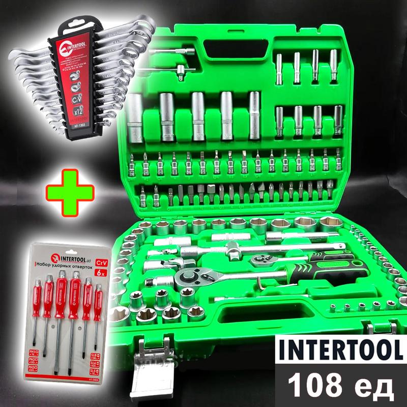 Набор ключей для ремонта 108ед + 12шт ключей + 6шт ударных отверток, Надежный набор инструментов, NST Комплект состоит из 3 позиций: 1. Набор инструментов INTERTOOL 108 ед. (1/2" и 1/4") 2. Набор ключей комбинированных INTERTOOL 12 шт., 6-22 мм CRV 3. Набор ударных отверток INTERTOOL 6 ед. Информация о наборе инструментов Набор включает 108 элементов для решения любой задачи на откручивание, закручивание креплений. Разнообразие торцевых головок в наборе позволяет выполнять подавляющее большинство задач по ремонту автомобиля, а также техники. В комплектацию вошли торцевые шестигранные головки от 4 до 32 мм, позволяющие откручивать крепления разных диаметров. Высокие головки и воротники нужны для откручивания гаек, болтов и шпилек в глубоких колодцах двигателей или в местах, где сложно их достать. В этот набор также добавлены головки Е профиля (TORX, «звездочки»), для того чтобы вы смогли работать с элементами ходовой и двигателя, а также с узкоспециализированными креплениями. Наличие свечных головок на 16 и 21 мм позволяет выкрутить зажигательную свечу в любой машине, а благодаря удлинителям и карданам это можно сделать даже в глубоких колодцах двигателей. Кроме этого в ассортимент набора вошли различные биты, которые пригодятся при ремонте бортовой техники, электроники, мебели и т.д. Комплектация - Трещотка 1/2" 72 зуба, реверсионная; - головка шестигранная торцевая 1/2" 17 ед.: 10, 11, 12, 13, 14, 15, 16, 17, 18, 19, 20, 21, 22, 24, 27, 30, 32 мм; - головка шестигранная продлена 1/2" 5 ед.: 14, 15, 17, 19, 22 мм; - головка торцевая TORX (звезда) 1/2" 8 ед.: Е10, Е11, Е12, Е14, Е16, Е18, Е20, Е24; - удлинитель 1/2" 125 мм; - ворот с плавающей головкой 1/2" 250 мм; - головка свечная 1/2" 2 ед.: 16 мм и 21 мм; - Кардан 1/2". - переходник 1/2" для бит; - Держатель 1/4" для головок и бит 150 мм. Бити: - HEX 5 ед.: 7, 8, 10, 12, 14 мм; - TORX 5 ед.: T40, T45, T50, T55, T60; - PH 2 ед.: PH3, PH4; - PZ 2 ед.: PZ3, PZ4; - SL 3 ед.: 8, 10, 12 мм. - головка с насадкой HEX 1/4" 4 ед.: 3, 4, 5, 6 мм; - головка с насадкой TORX 1/4" 7 ед.: T8, T10, T15, T20, T25, T27, T30; - головка с насадкой SL 1/4" 3 ед.: 4, 5.5, 6.5 мм; - головка с насадкой PH 1/4" 2 ед.: PH1, PH2; - головка с насадкой PZ 1/4" 2 ед.: PZ1, PZ2. - Трещотка 1/4" 72 зуба, реверсионная; - головка шестигранная торцевая 1/4" 13 ед.: 4, 4.5, 5, 5.5, 6, 7, 8, 9, 10, 11, 12, 13, 14 мм; - шестигранная головка продлена 1/4" 8 ед.: 6, 7, 8, 9, 10, 11, 12, 13 мм; - головка торцевая TORX (звезда) 1/4" 5 ед.: Е4, Е5, Е6, Е7, Е8; - удлинитель 1/4" 2 ед.: 50, 100 мм; - ворот 1/4" с плавающей головкой 110 мм; - кардан 1/4"; - Г-образные шестигранные ключи 3 ед.: 1.5, 2, 2.5 мм. Информация о комбинированных ключей 12 шт. В наборе рожково-кидочные ключи, размерами: 6, 7, 8, 9, 10, 11, 12, 13, 14, 17, 19, 22 мм. Это позволяет выбрать требуемый размер под любые задачи для монтажа и демонтажа резьбовых соединений гаек и болтов. Ключи изготовлены из прочной Cr-V стали, не подверженной разрушению, имеют повышенный запас прочности и выдерживают большие нагрузки. Информация о наборе ударных отверток 6 ед Набор используется для откручивания ржавых и прикипелых винтов и саморезов. Этот тип отверток в большинстве своем предназначен для бытового использования, хотя и в других производственных отраслях эти отвертки себе зарекомендовали положительным образом. Отверточные хвостовики изготовлены из хром-ванадиевой стали, которая обеспечивает высокие эксплуатационные показатели и защиту от коррозии. В наборе 6 отверток с насадками SL5, SL6, SL8; PH1, PH2, PH3. Особенности - Отверточные хвостовики сделаны из хром-ванадиевой стали, что делает инструмент прочным и надежным, с антикоррози