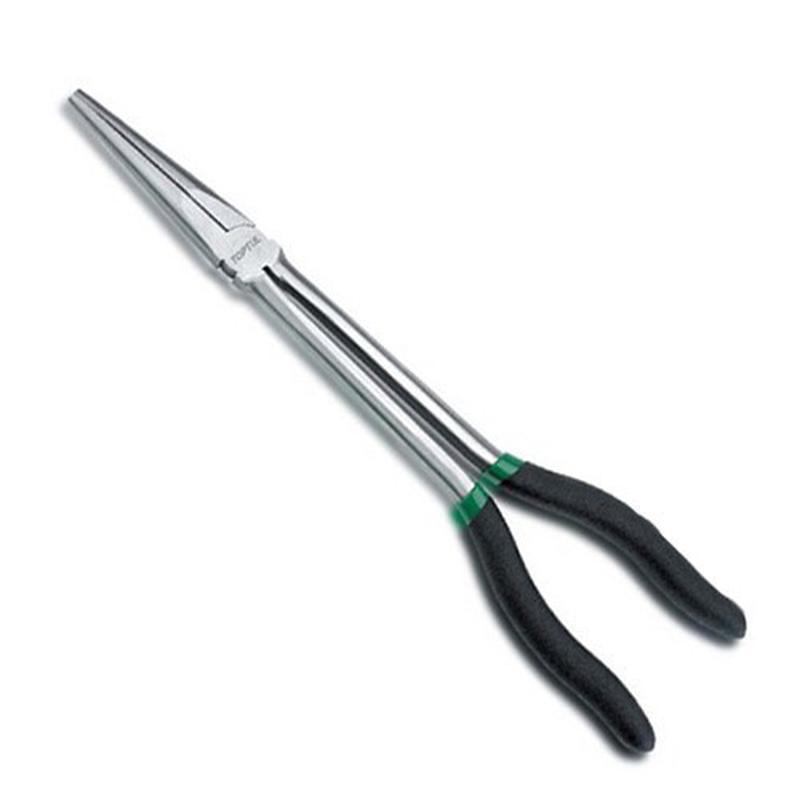 На сьогодні у світі розроблено новаторами і інструментальними заводами вироблено велику кількість всіляких тех. засобів діагностики і спец. ремонту колісного автотранспорту. Відноситься до типу шарнірно - губцевым інструментів, плоскогубці можна відшукати в будь-якому будинку та придбати в будь-якому будівельному магазині. Напевно кожен другий чоловік, хоча б раз за все життя користувався таким універсальним інструментом. Існує кілька видів плоскогубців, наприклад, плоскогубці подовжені. Вони використовуються при ремонті різноманітної техніки та обладнання, а також для електромонтажних робіт як утримуючий інструмент. | Плоскогубці подовжені - це кліщі, губки яких пірамідальної, подовженої форми з нанесеною на внутрішні плоскі поверхні насічкою, що сприяють зручній роботі з деталями розташованими у важкодоступних місцях. З допомогою шарніра високої точності рухається робоча частина інструмента, що дозволяє забезпечити плавну роботу. Плоскогубці подовжені використовуються для захоплення дрібних деталей і здійснення з ними різних маніпуляцій (загинання, скручування, перекушування проводів і дроту). Також плоскогубці оснащені ізолюючими зручними рукоятками з м'якими накладками для зручного захоплення. | Якість інструменту майже завжди залежить від міцного матеріалу з якого він виготовляється. У виготовленні інструменту виробництва заводу TOPTUL застосовує безліч новітніх спец. технологій обробки. У технології виробництва даного інструменту використовується високоякісна хроммолібденовая сталь індукційної загартування, для кращої якості і надійності. Інструменти TOPTUL відрізняються високою якістю, надійністю і широким терміном служби, а на деякі групи інструменту навіть поширюється довічна гарантія. Купити плоскогубці подовжені - це значить, зробити вірний вибір на користь довговічності, надійності, якості та ергономічної функціональності.