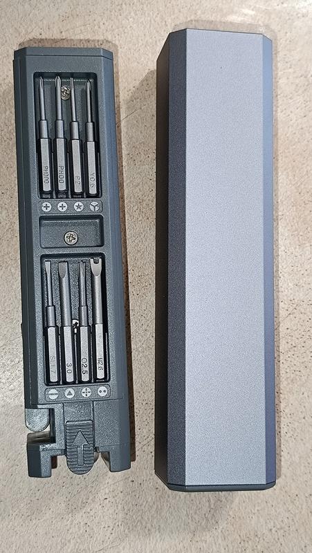 отвёртка с насадками в кейсе Набор крепких прецизионных (точных) отверток из 71 предметов и металлической ручки-держателя в алюминиевом корпусе с системой Push to Open. В набор входят металлическая ручка из алюминиевого сплава, пинцет, лопатка и 69 бит(12 штук 40 мм) ( 57 штук 30 мм) длиной из стального сплава S2. Все это компактно и надежно размещается на пластиковой платформе и прячется в стильный алюминиевый футляр. Биты крепятся к платформе за счет встроенных в нее мощных магнитов, поэтому держатся крепко. Этот комплект идеально подходит для ремонта практически любой электроники и механических приборов, включая смартфоны, ноутбуки, часы и т.д. Биты в наборе: прямой шлиц: SL1.5, SL1.7, SL2.5, SL3.0 крестообразные Phillips: PH000, PH00, PH0, PH1 крестообразная Pinhead Phillips: 2.5 Y-образные (мерседес): Y0.6 5-лучевая звезда Pentalobe: P2, P5 шестигранные: H1.5, H2.0, H2.5 треугольные: 2.3, 3.0 U-образные (подковая): 2.6 6-лучевая звезда Torx: T1, T2, T3, T4, T5 6-лучевая звезда Torx с отверстием: T6H, T8H, T10H, T15H, T20H Комплектация: ручка-держатель-отвертка из алюминиевого сплава 69 бит длиной 40 мм пинцет лопатка алюминиевый кейс Оплата доступна только наложенным платежом либо на карту банка либо пром- оплата.