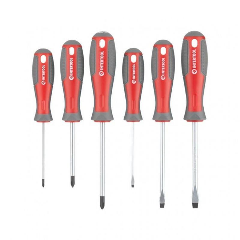 Набор отверток 6 ед (SL3.0*75мм, SL5.0*100мм, SL6.0*100мм, PH0*75мм, PH1*75мм, PH2*100мм) INTERTOOL VT-3346 Набор отверток INTERTOOL изготовлен по последним технологиям и соответствует высоким запросам мастеров. Предназначен для монтажа и демонтажа резьбовых соединений с типом шлица: SL3, SL5, SL6, PH0, PH1, PH2. Комплект станет отличным помощником в домашнем арсенале инструмента, а также в собственной мастерской, на производстве. Высокое качество стали Стержень отверток изготовлен из прочной Cr-V стали, которая известна всем мастерам своей надежностью и выносливостью. В составе этой стали присутствуют хром и ванадий, которые придают изделию высокую стойкость к износу. Также сталь отличается долговечностью и не подвержена хрупкому разрушению. Конструкция отверток продумана до мелочей Стержень глубоко посажен в рукоятку и крепиться в двух местах, что исключает возможность срыва. Намагниченный наконечник Отвертки имеют усиленный магнитный наконечник, который удерживает крепеж и облегчает работу в труднодоступных местах. Удобная рукоятка Форма ручек обеспечивает максимальную эффективность от приложенного усилия. Прорезиненная двухкомпонентная рукоятка удобно лежит в руке и не выскальзывает из ладони. Яркая маркировка на конце рукоятки позволяет быстро найти необходимый тип и размер отвертки. Комплектация Отвертки: SL3*75мм, SL5*100мм, SL6*100мм, PH0*75мм, PH1*75мм, PH2*100мм.