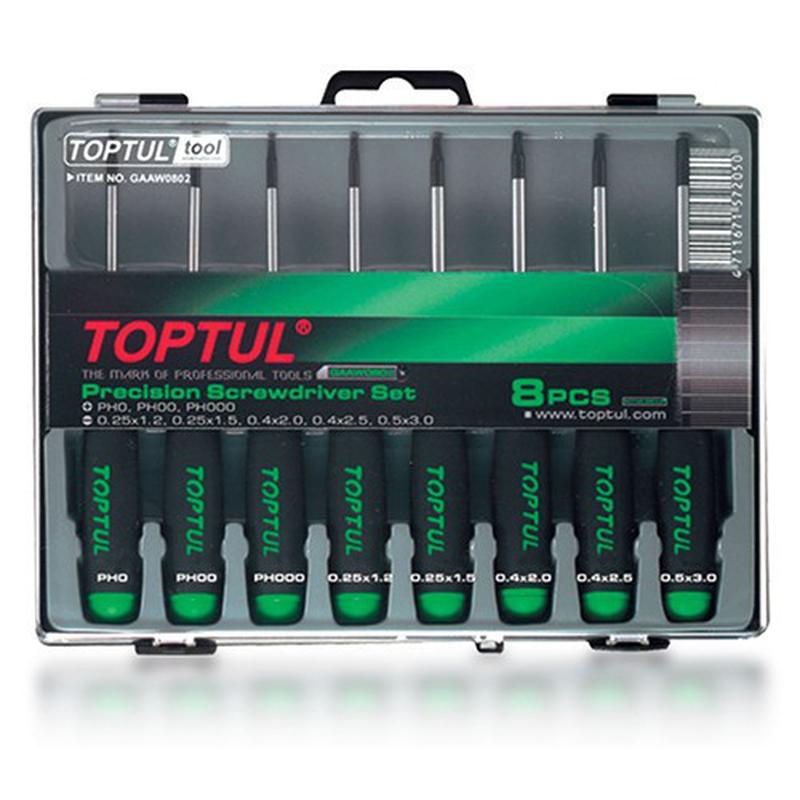 Набір прецизійних викруток TOPTUL (PH000-PH0, SL1.2-SL3) 8ед. GAAW0802. У комплектації 8 прецезионных викруток. Прецезійні викрутки використовуються при роботі з дрібними деталями, гденеобходима найвища точність.