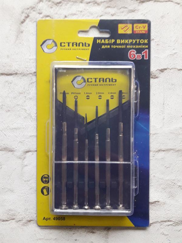 Набор отверток для точной механики, 6 шт. (SL1.4, SL2, SL2.4, SL3, PH0, PH1) Сталь Набор Сталь 49058 -- вещь, которая должна быть в рабочем арсенале любого мастера. Инструментов никогда не бывает слишком много, а хороших инструментов тем более. Данный набор позволяет выполнять широкий спектр работ. Материалы только высокого качества обеспечивают долговечность и надежную работу. Представленные в каталоге наборы обеспечат высокое качество результата.